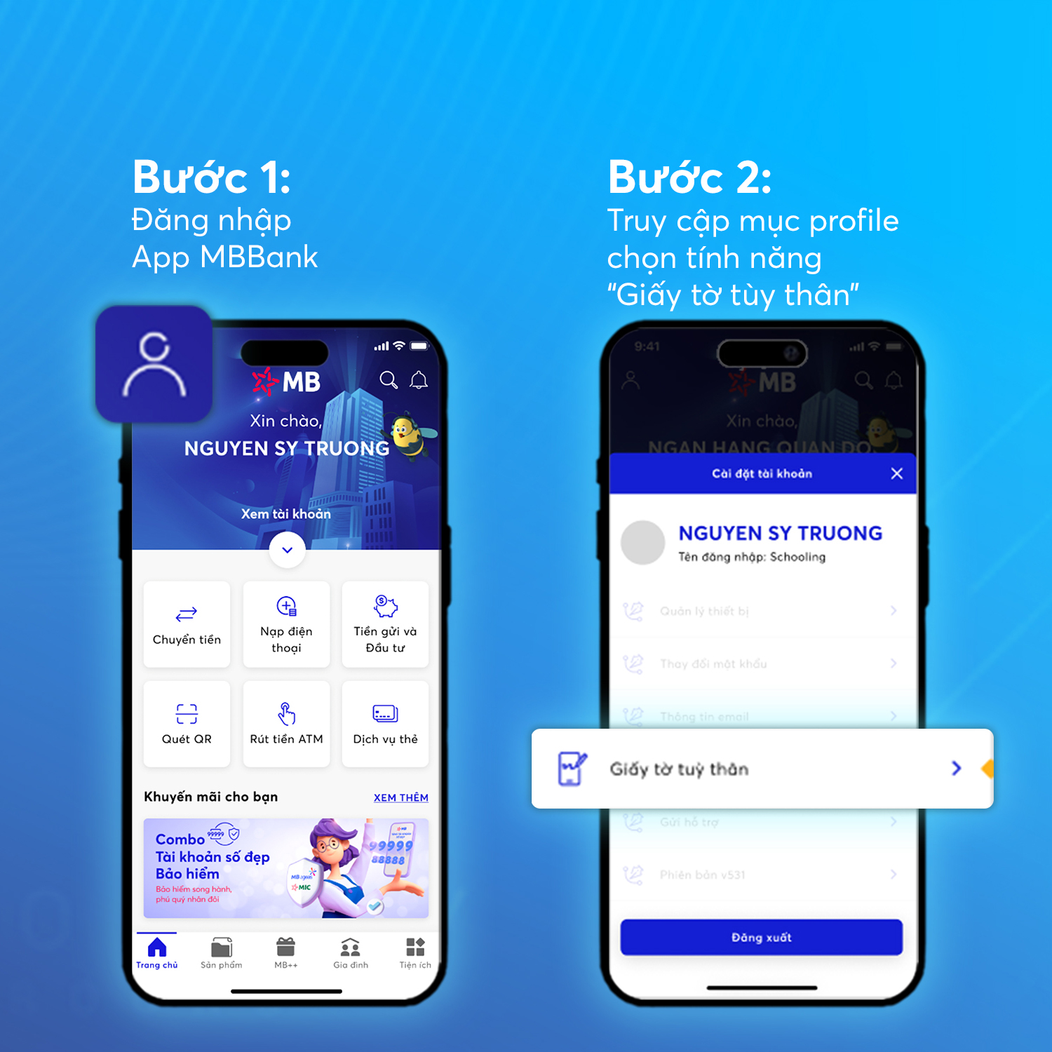 Cách 2 - Thực hiện tại quầy giao dịch của MB Chuẩn bị: CCCD gắn chip Hướng dẫn: Tới chi nhánh/ phòng giao dịch MB gần nhất để giao dịch viên hỗ trợ khách hàng cập nhật.