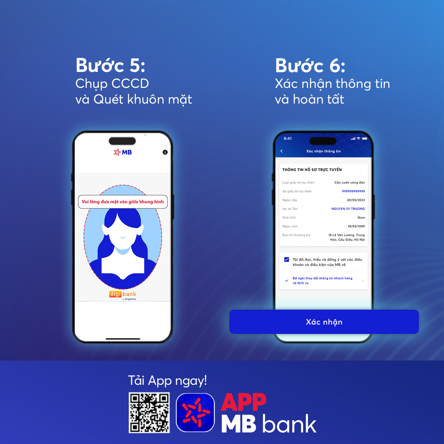 Bước 5: Quét khuôn mặt; thực hiện theo các bước chụp CCCD mặt trước/sau và quét NFC