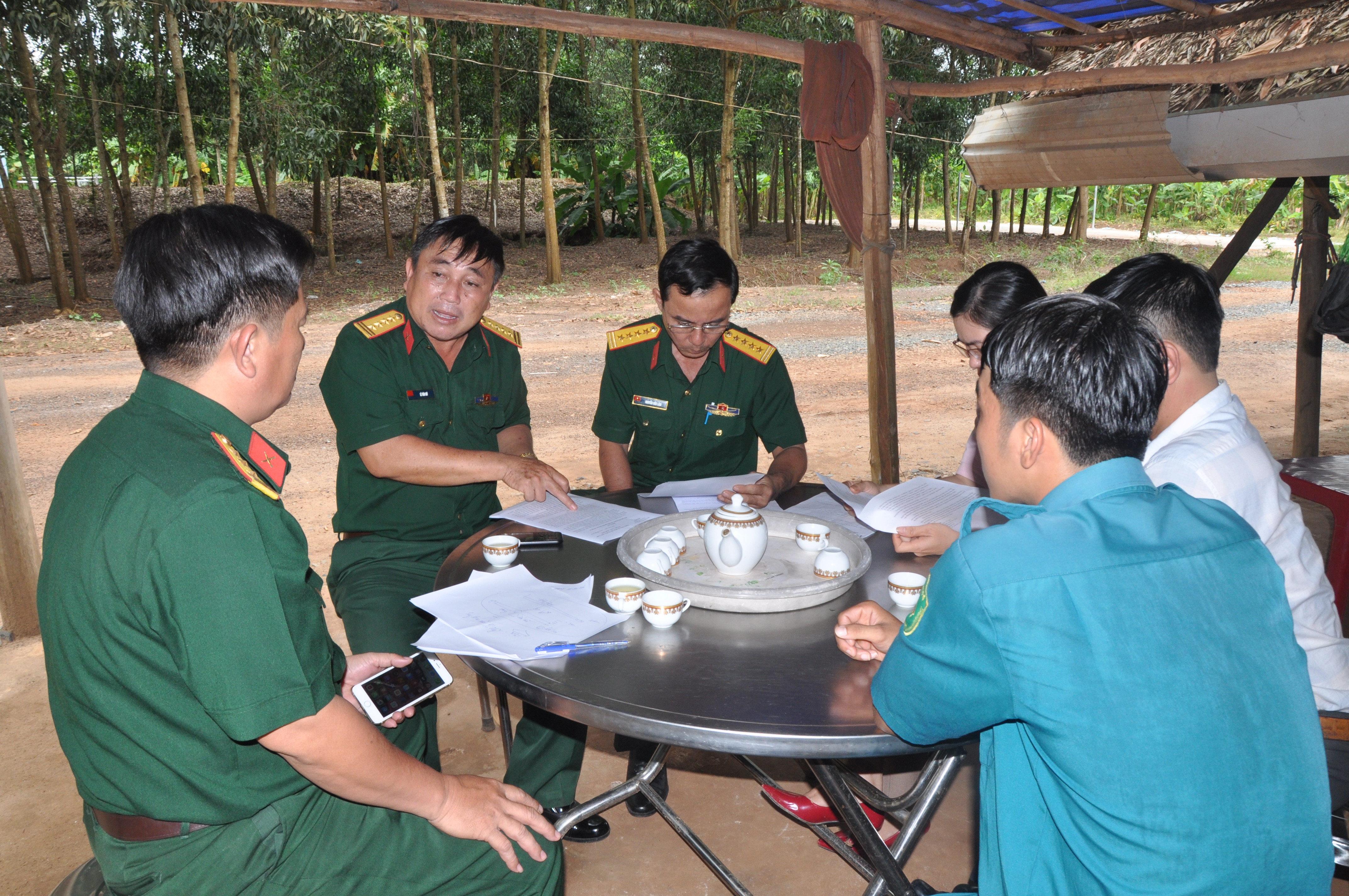 Đại tá Lê Văn Mỹ, Chính trị viên đội K71, Bộ CHQS tỉnh Tây Ninh báo cáo kết quả thống nhất các khu vực đào tìm kiếm hài cốt liệt sĩ.