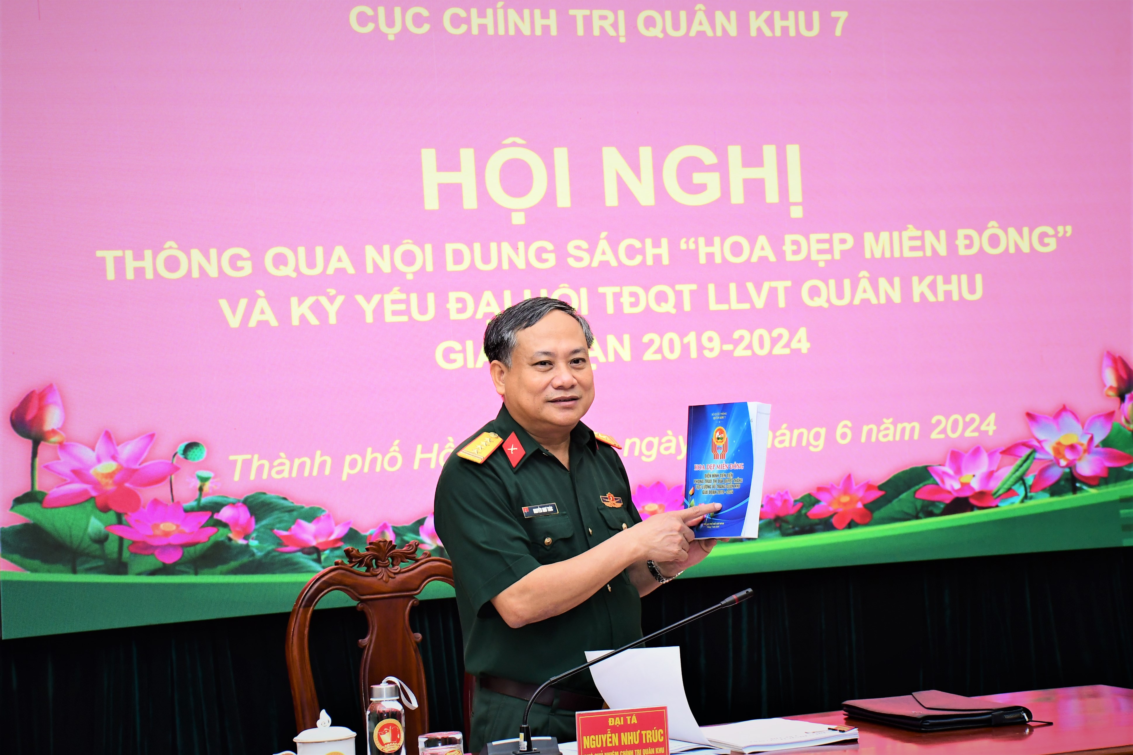 (QK7 Online) - Ngày 27/6, Cục Chính trị Quân khu tổ chức hội nghị thông qua nội dung sách “Hoa đẹp miền Đông” và Kỷ yếu Đại hội Thi đua Quyết thắng LLVT Quân khu giai đoạn 2019 - 2024. Đại tá, TS Nguyễn Như Trúc, Phó Chủ nhiệm Chính trị Quân khu, Trưởng ban Biên soạn sách và kỷ yếu chủ trì hội nghị.