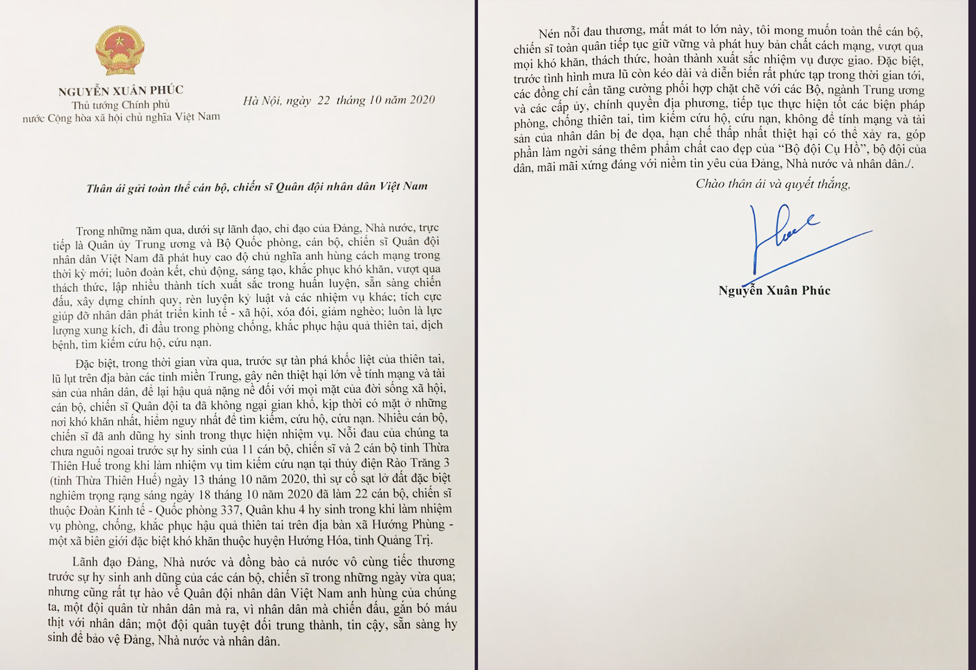 Hôm nay, 22/10, Thủ tướng Chính phủ Nguyễn Xuân Phúc đã có thư gửi toàn thể cán bộ, chiến sĩ Quân đội nhân dân Việt Nam.