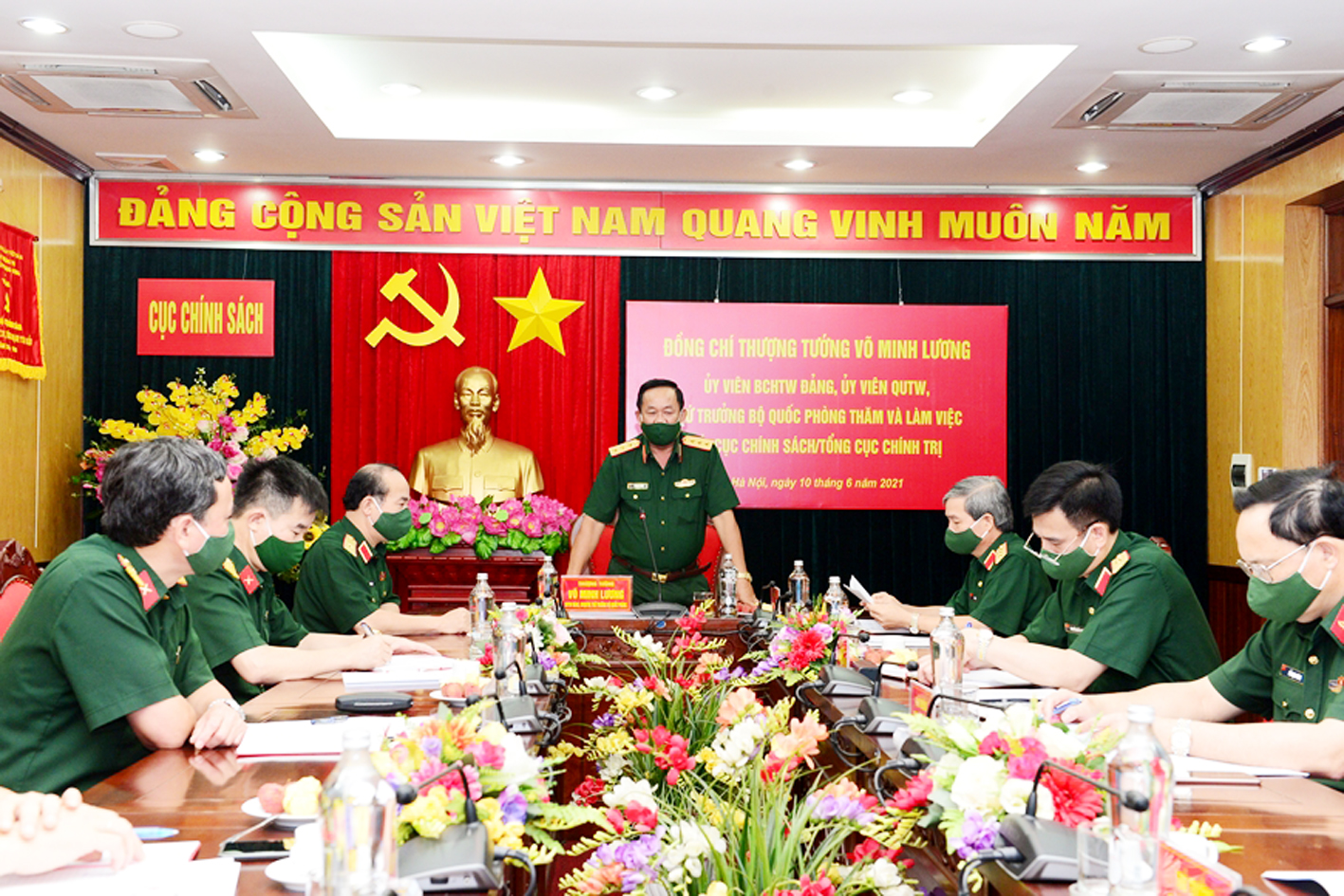 Thượng tướng Võ Minh Lương làm việc với Cục Chính sách, Tổng cục Chính trị. Ảnh: Duy Thành.