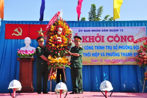 Đồng chí Nguyễn Trung Đông, đại diện Ban CHQS quận 12 nhận hoa chúc mừng của Thiếu tướng Trương Văn Hai , Tư lệnh Bộ Tư lệnh TP.Hồ Chí Minh tại lễ khởi công xây dựng trụ sở Ban CHQS các phường của quận 12