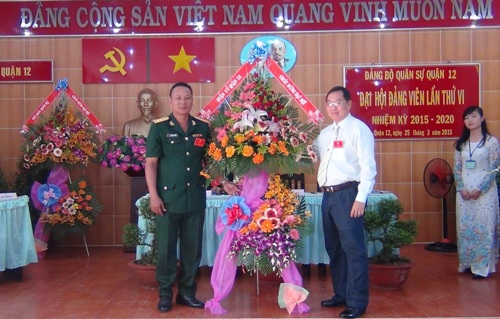 Đồng chí Nguyễn Trung Đông, đại diện Đảng bộ Quân sự quận 12 nhận hoa chúc mừng đại hội do đồng chí Trần Hữu Trí, Bí thư Quận ủy quận 12 trao tặng