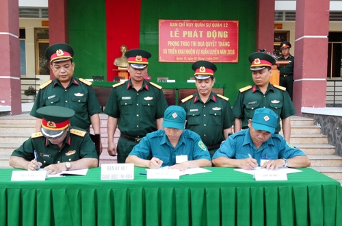 Đồng chí Nguyễn Trung Đông (hàng đứng thứ 2 từ trái sang) cùng các đồng chi trong Ban CHQS quận 12 chứng kiến các Cụm thi đua LLVT quận ký kết giao ước thi đua