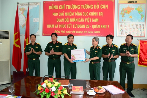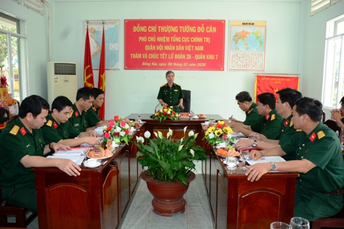 (QK7 - Online) ​ Ngày 8-1, Thượng tướng Đỗ Căn, Phó Chủ nhiệm Tổng cục Chính trị dẫn đầu đoàn công tác của Tổng Cục chính trị đã đến thăm, chúc Tết cán bộ, chiến sĩ Trường sĩ quan Lục quân 2, Lữ đoàn Pháo binh 75, Lữ đoàn Tăng thiết giáp 26, Bộ CHQS tỉnh Đồng Nai, Bệnh viện Quân y 175; Sư đoàn Không quân 370; Lữ đoàn Thông tin 596, cùng đi với đoàn có Thiếu tướng Võ Văn Thi, Phó Tư lệnh Quân khu 7.