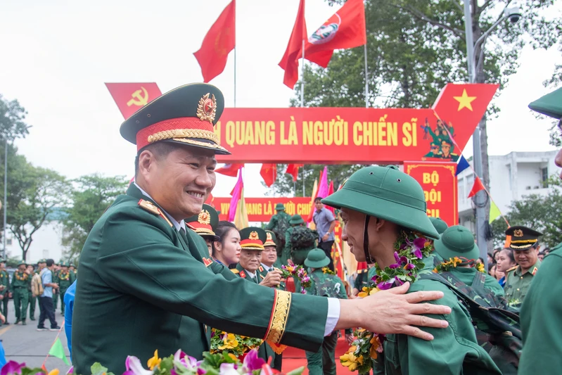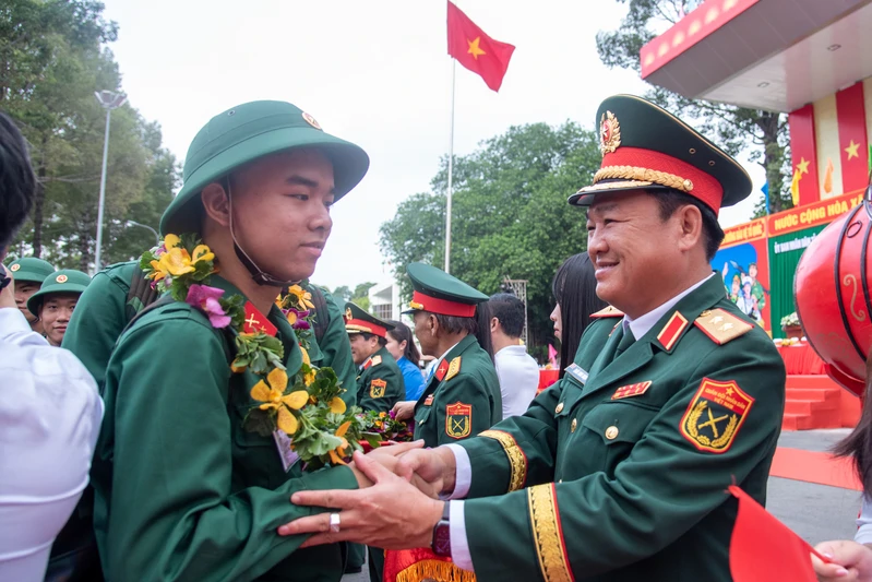 Trung tướng Trần Vinh Ngọc, Bí thư Đảng ủy, Chính ủy Quân khu 7 động viên các thanh niên lên đường nhập ngũ.
