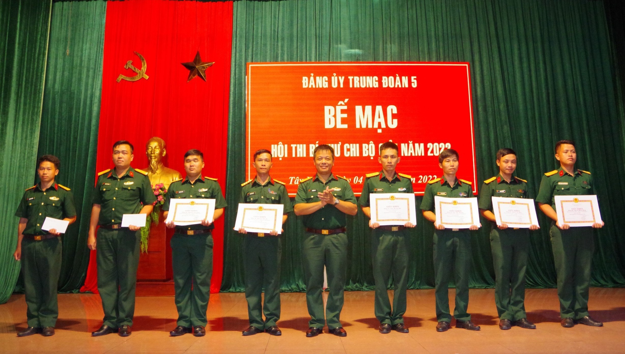 Thượng úy Trần Lê Minh Thông (bìa phải) đạt giải Ba hội thi Bí thư chi bộ giỏi cấp Trung đoàn năm 2022.