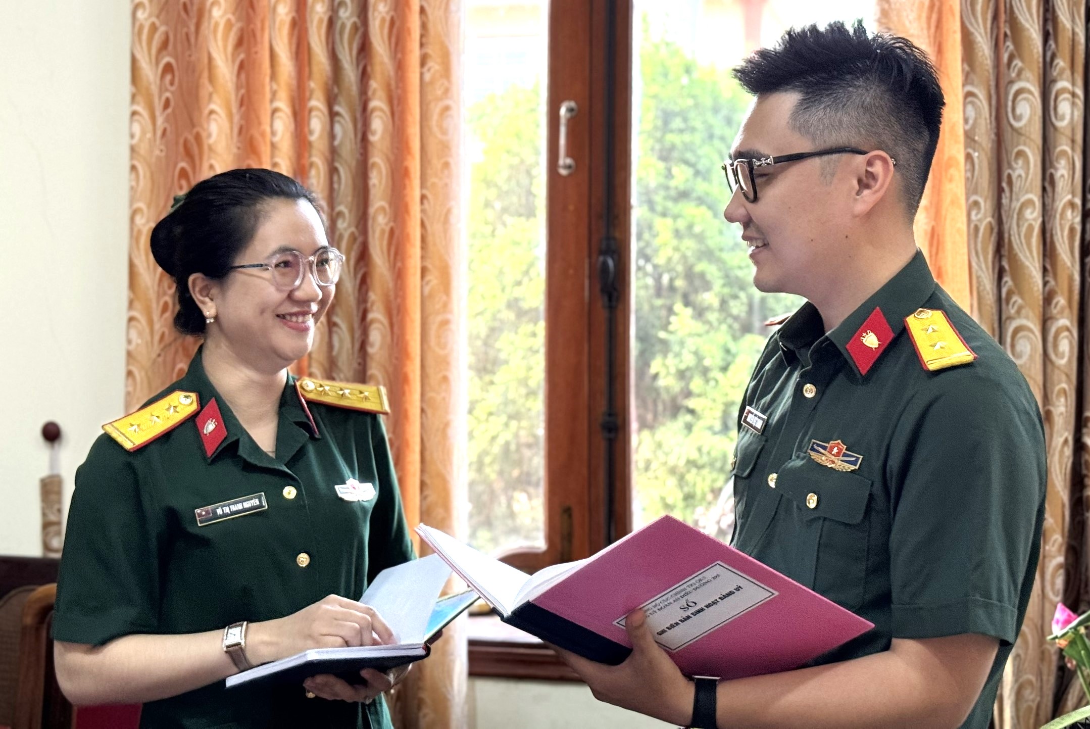 Thượng úy Võ Thị Thanh Nguyên trao đổi công việc chuyên môn với đồng nghiệp.