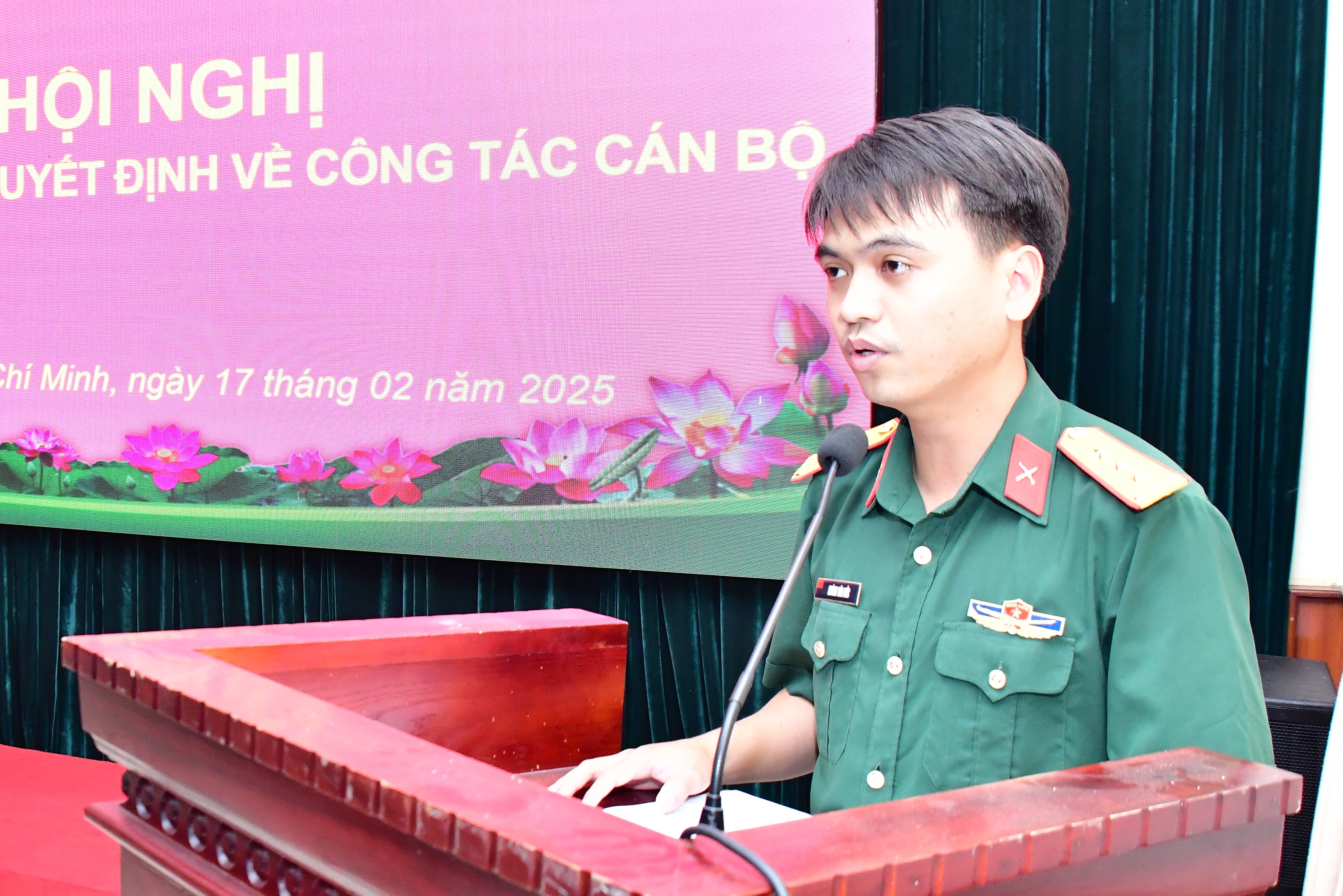 Đại diện các đồng chí nhận quyết định, Thượng úy Huỳnh Văn Đức, Trợ lý Bảo tàng Quân khu, hứa sẽ cố gắng học tập nâng cao trình độ, năng lực, trang bị các kiến thức tổng hợp, nhất là những kỹ năng cần thiết cho quá trình công tác; quyết tâm đem hết khả năng, sức trẻ, tinh thần nhiệt huyết để cống hiến cho đơn vị, góp phần xây dựng đơn vị vững mạnh toàn diện “mẫu mực, tiêu biểu”.