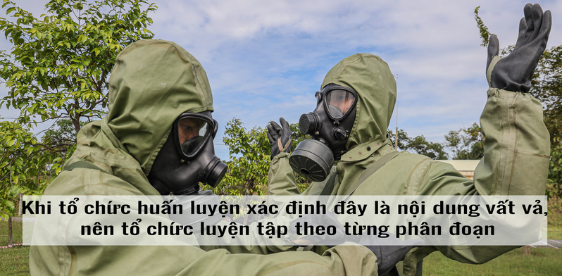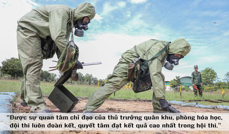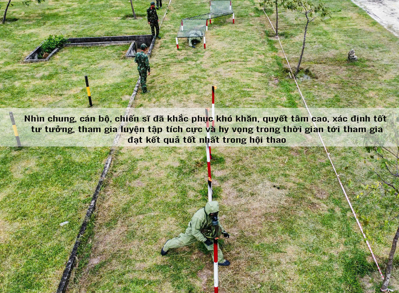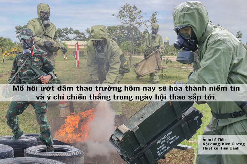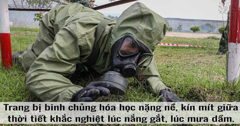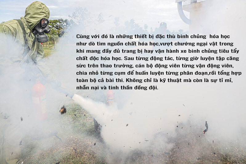 Trang bị binh chủng hóa học nặng nề, kín mít giữa thời tiết khắc nghiệt lúc nắng gắt, lúc mưa dầm. Cùng với đó là những thiết bị đặc thù binh chủng hóa học như dò tìm nguồn chất hóa học, vượt chướng ngại vật trong khi mang đầy đủ trang bị hay vận hành xe binh chủng tiêu tẩy chất độc hóa học. Sau từng động tác, từng giờ luyện tập căng sức trên thao trường, cán bộ động viên từng vận động viên, chia nhỏ từng cụm để huấn luyện từng phân đoạn, rồi tổng hợp toàn bộ cả bài thi. Không chỉ là kỹ thuật, mà còn là sự tỉ mỉ, nhẫn nại và tinh thần đồng đội.