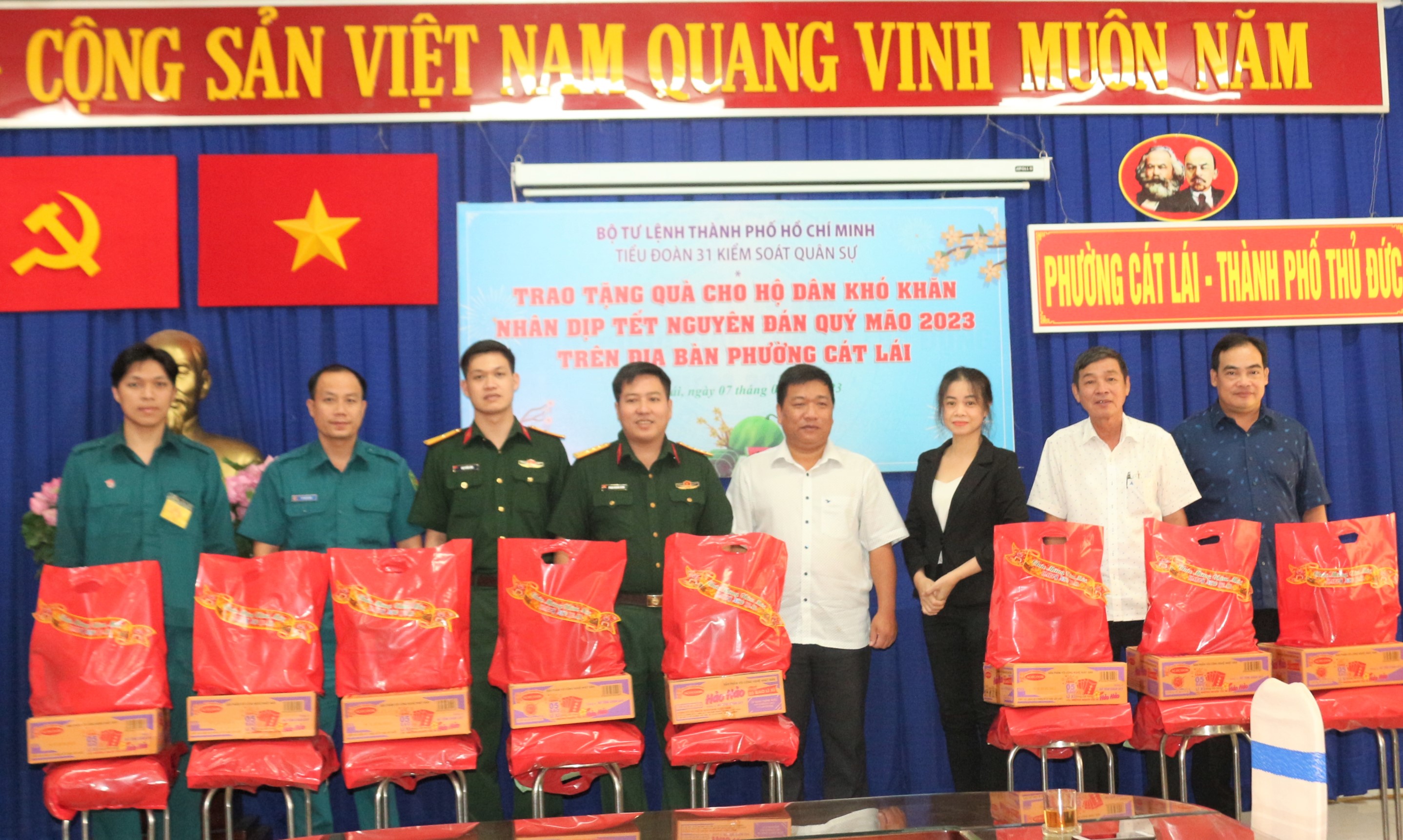 (QK7 Online) - Nhân dịp Tết Nguyên đán Quý Mão 2023, sáng 7/1, Thành phố Thủ Đức, TPHCM, Tiểu đoàn KSQS 31, Bộ Tư lệnh TPHCM trao 100 suất quà, mỗi suất trị giáo 500 ngàn đồng cho hộ dân có hoàn cảnh khó khăn sinh sống trên địa bàn phường Cát Lái.
