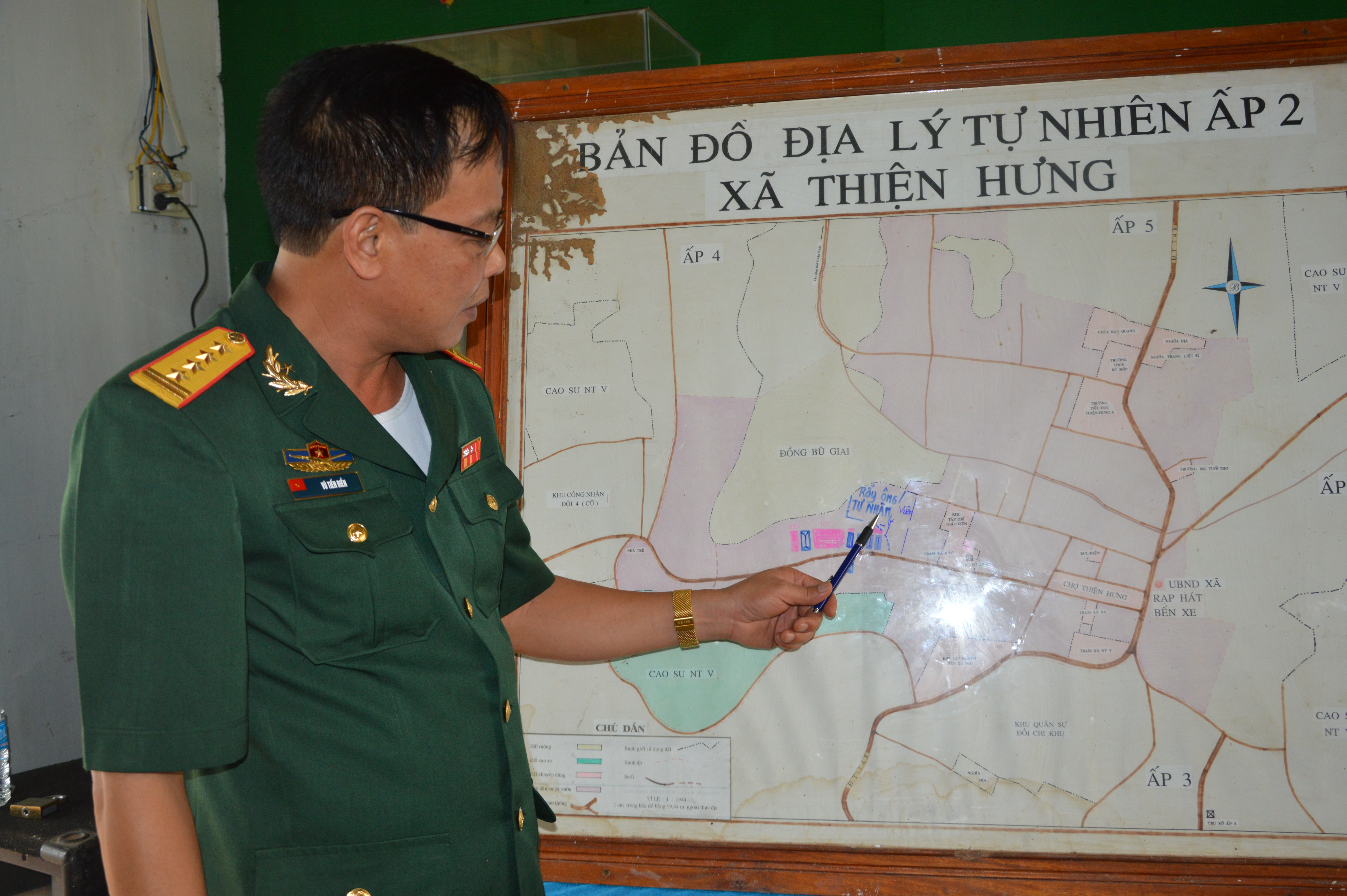 Đại tá Vũ Tiến Điền, Chính ủy Bộ CHQS tỉnh Bình Phước xác định vị trí hố chôn tập thể trên bản đồ.