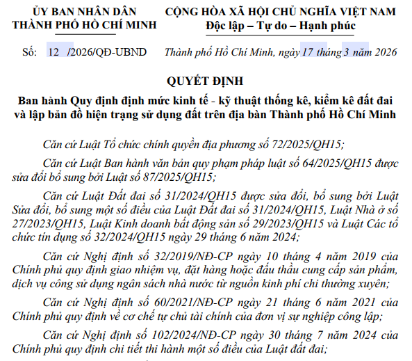 Từ ngày 31/3/2026, TP.HCM chính thức áp dụng Quyết định số 12/2026/QĐ-UBND ban hành Quy định định mức kinh tế - kỹ thuật thống kê, kiểm kê đất đai và lập bản đồ hiện trạng sử dụng đất. Đây là văn bản cụ thể hóa Luật Đất đai 2024, giúp công tác đo đạc đất đai tại các xã, phường trở nên bài bản, tiết kiệm và minh bạch hơn.