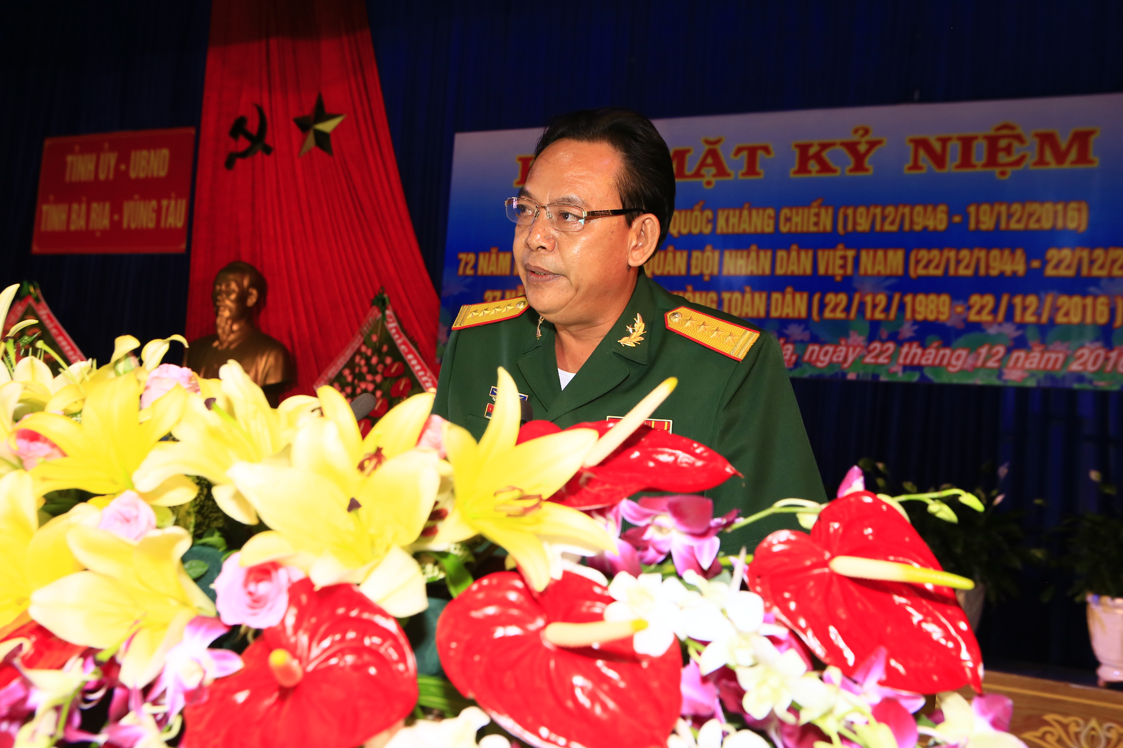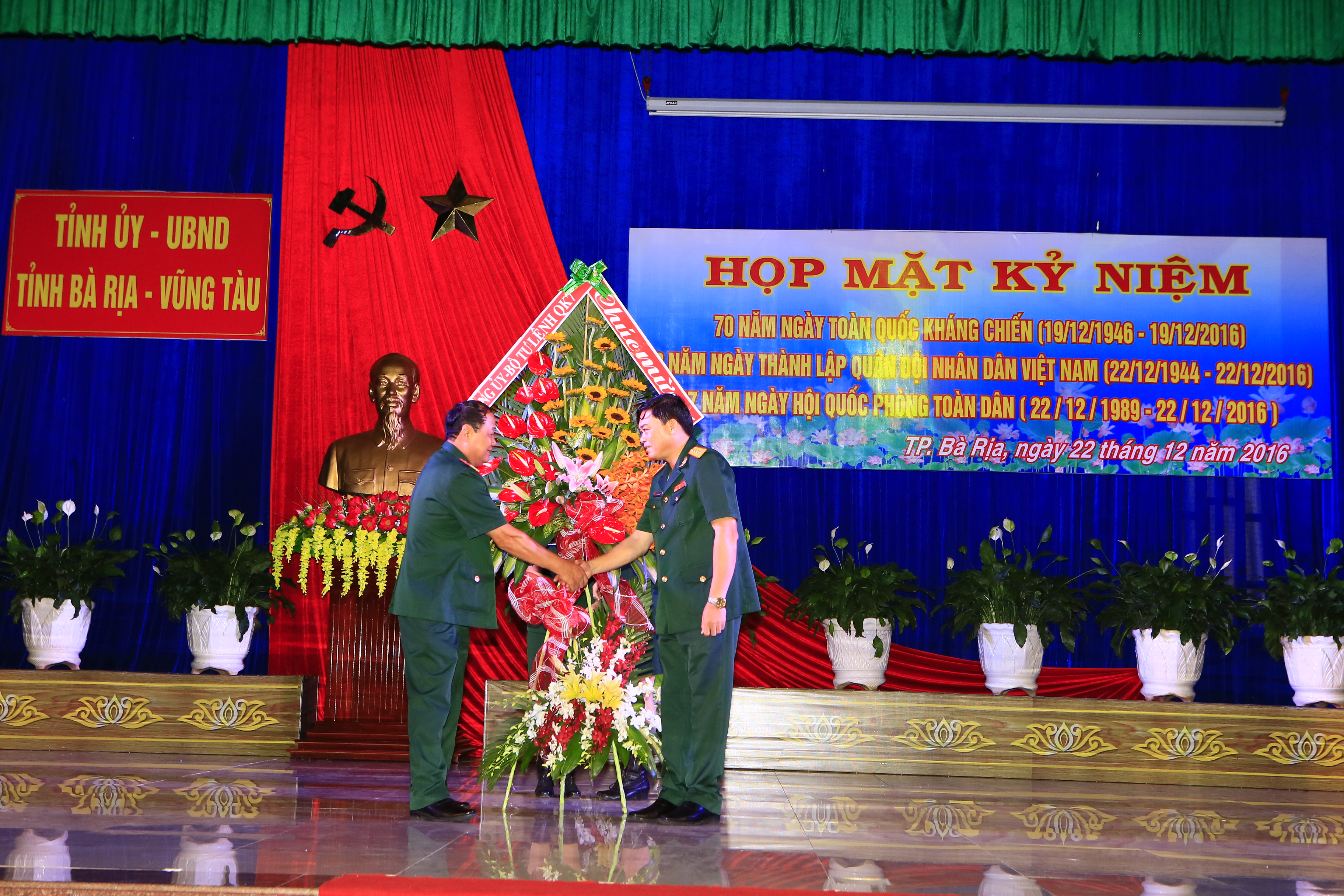 (QK7 Online) – Sáng ngày 22/12/2016, tại Hội trường Bộ CHQS tỉnh, Tỉnh ủy, UBND tỉnh Bà Rịa – Vũng Tàu tổ chức họp mặt kỷ niệm 70 năm Ngày toàn quốc kháng chiến (19/12/1946 – 19/12/2016), 72 năm Ngày thành lập Quân đội nhân dân Việt Nam (22/12/1944 – 22/12/2016), 27 năm Ngày hội quốc phòng toàn dân (22/12/1989 – 22/12/2016). Dự lễ có Thiếu tướng Ngô Ngọc Bình, Ủy viên Thường vụ Đảng ủy, Phó Tư lệnh Quân khu 7; các đồng chí lãnh đạo, nguyên là lãnh đạo Tỉnh ủy, UBND, Bộ CHQS tỉnh qua các thời kỳ cùng các đồng chí sĩ quan cao cấp đang công tác và nghỉ hưu trên địa bàn tỉnh Bà Rịa – Vũng Tàu.