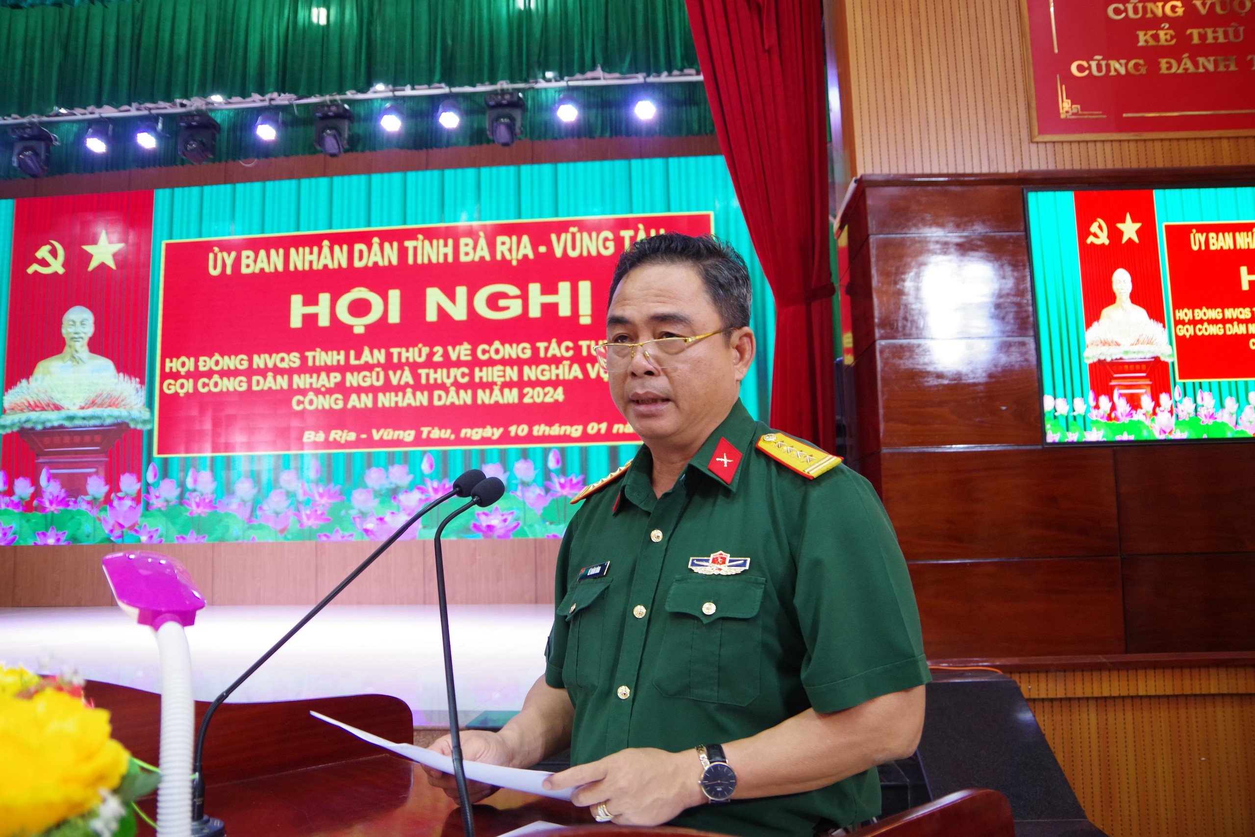 Đại tá Lê Xuân Bình, Chỉ huy trưởng Bộ CHQS tỉnh, Phó Chủ tịch Thường trực Hội đồng NVQS tỉnh phát biểu tại hội nghị