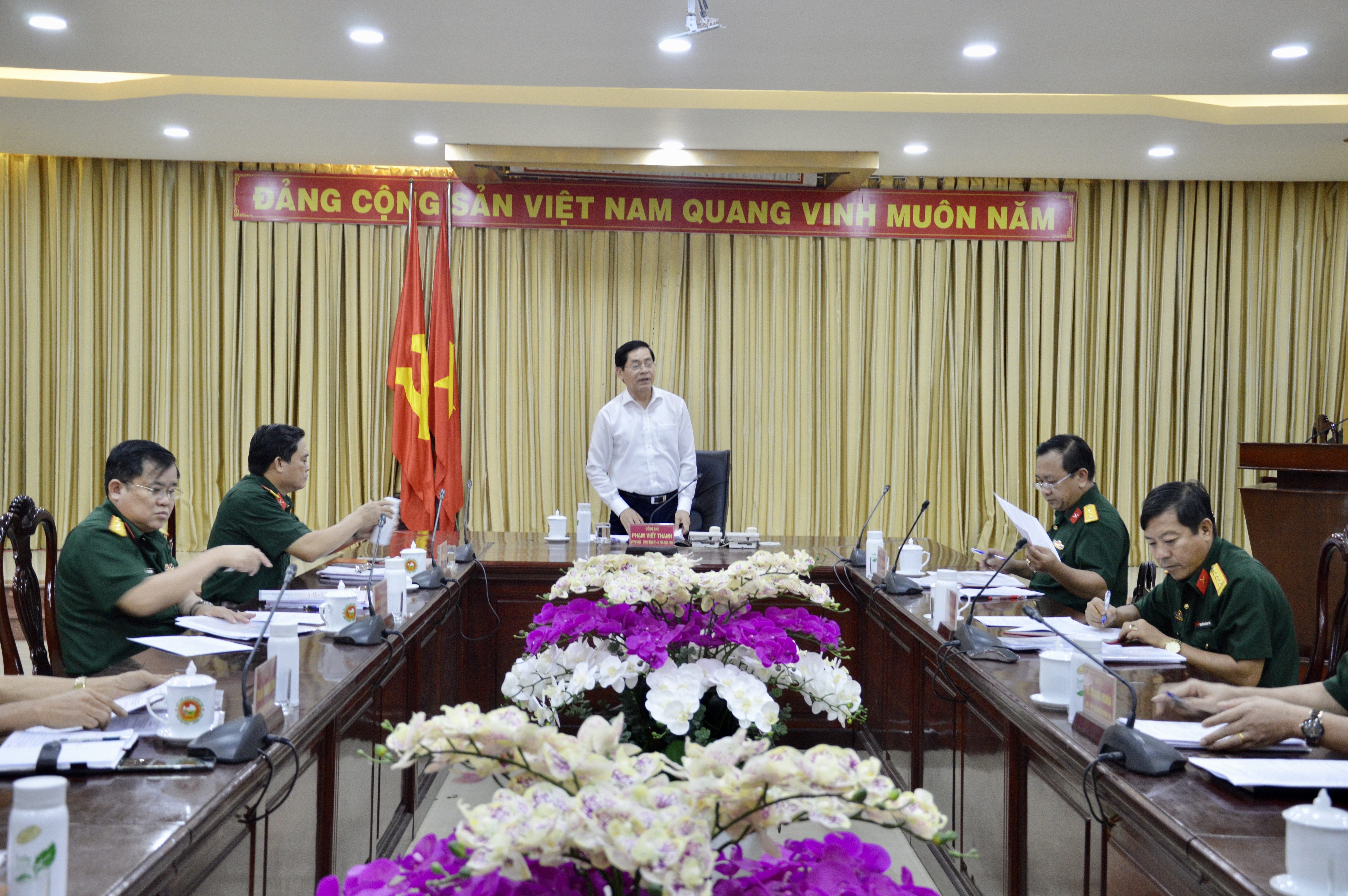 (QK7 Online) - Sáng 5/4, Ban Thường vụ Đảng uỷ Quân sự tỉnh tổ chức cuộc họp triển khai công tác lãnh đạo nhiệm vụ quân sự - quốc phòng địa phương quý II/2021. Ông Phạm Viết Thanh, Ủy viên Trung ương Đảng, Bí thư Tỉnh ủy, Bí thư Đảng ủy Quân sự tỉnh chủ trì cuộc họp.