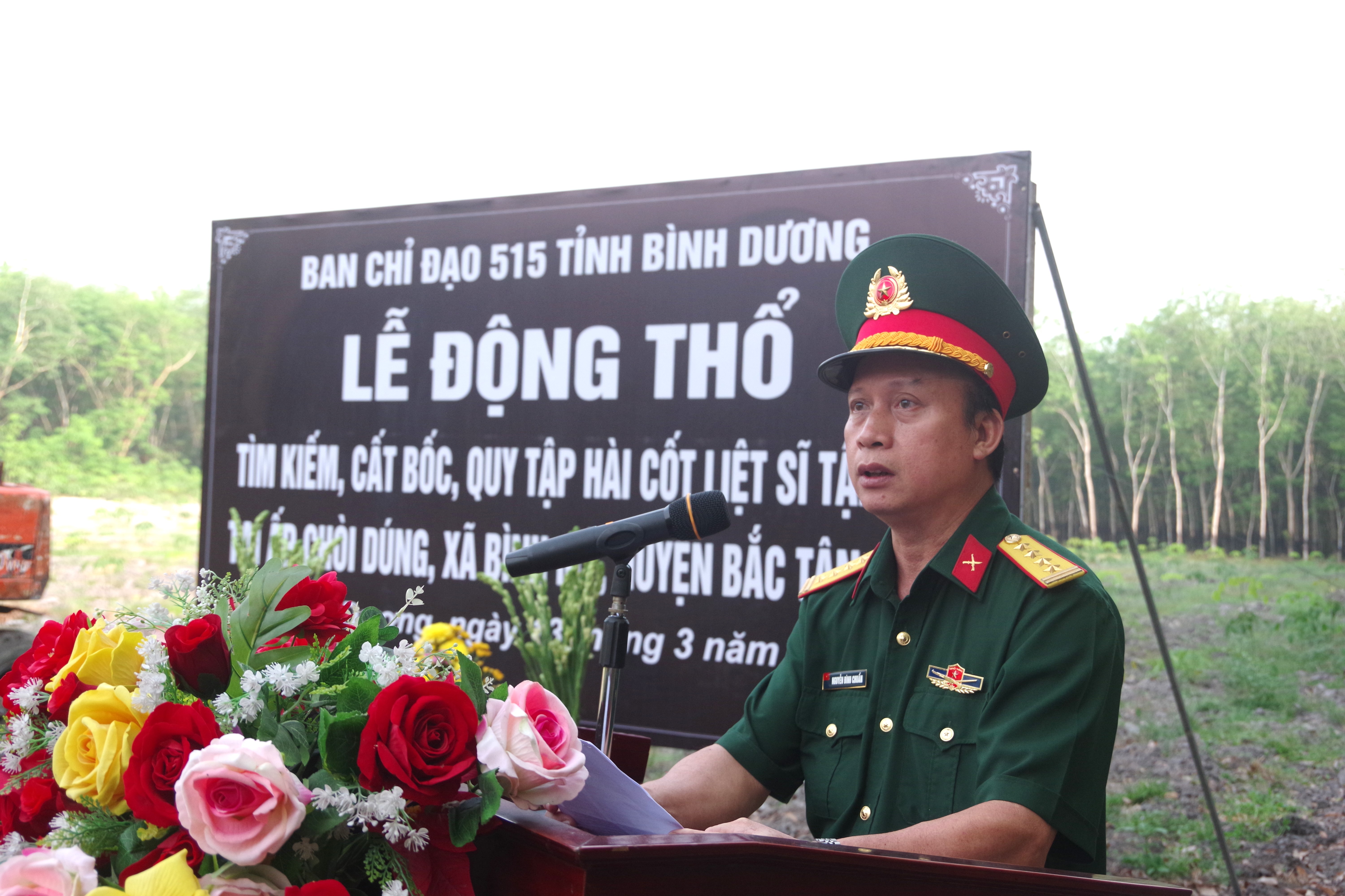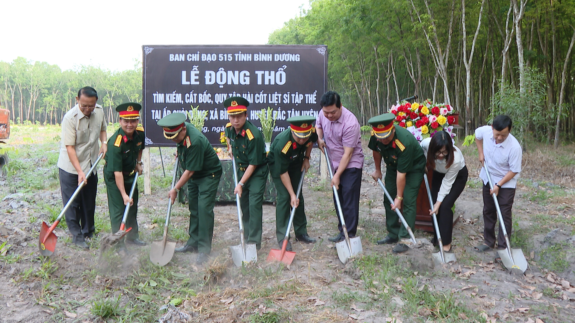 (QK7 Online) - Hướng tới kỷ niệm 70 năm Chiến thắng Điện Biên Phủ (7/5/1954 - 7/5/2024), ngày 13-3, Ban Chỉ đạo 515 tỉnh Bình Dương tổ chức lễ động thổ tiến hành tìm kiếm, quy tập hài cốt liệt sĩ tại ấp Chòi Dúng, xã Bình Mỹ, huyện Bắc Tân Uyên. Dự buổi lễ có Đại tá Nguyễn Hoàng Minh, Chỉ huy trưởng Bộ CHQS tỉnh; Đại tá Nguyễn Đình Chuẩn, Chính ủy Bộ CHQS tỉnh, Phó Chủ tịch Thường trực Ban Chỉ đạo 515 tỉnh Bình Dương.