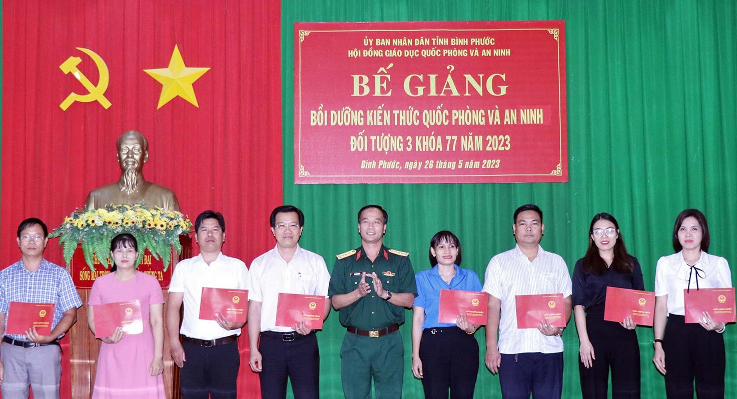 (QK7 Online) - Ngày 26-5, Hội đồng Giáo dục quốc phòng và an ninh tỉnh Bình Phước tổ chức bế giảng lớp bồi dưỡng kiến thức quốc phòng và an ninh cho đối tượng 3, khóa 77 năm 2023.