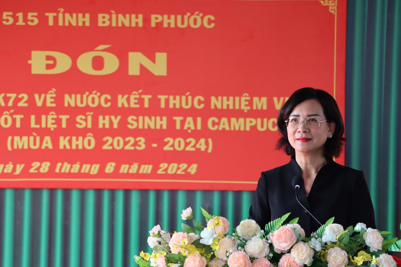 Phát biểu tại buổi lễ, đồng chí Trần Thị Tuyết Minh, Ủy viên Thường vụ Tỉnh ủy, Phó Chủ tịch UBND tỉnh, Trưởng Ban Chỉ đạo 515 tỉnh Bình Phước bày tỏ lòng biết ơn vô hạn đối với các anh hùng liệt sĩ đã cống hiến, hy sinh vì sự nghiệp xây dựng, bảo vệ Tổ quốc và làm nghĩa vụ quốc tế cao cả. Những năm tháng chiến đấu trên nước bạn Campuchia, các chiến sĩ quân tình nguyện Việt Nam đã phát huy truyền thống kiên cường, bất khuất của dân tộc; vượt qua mọi khó khăn gian khổ; hy sinh quên mình vì sự nghiệp đấu tranh giành độc lập tự do, vun đắp tình đoàn kết hữu nghị giữa hai dân tộc, hai nước Việt Nam - Campuchia.