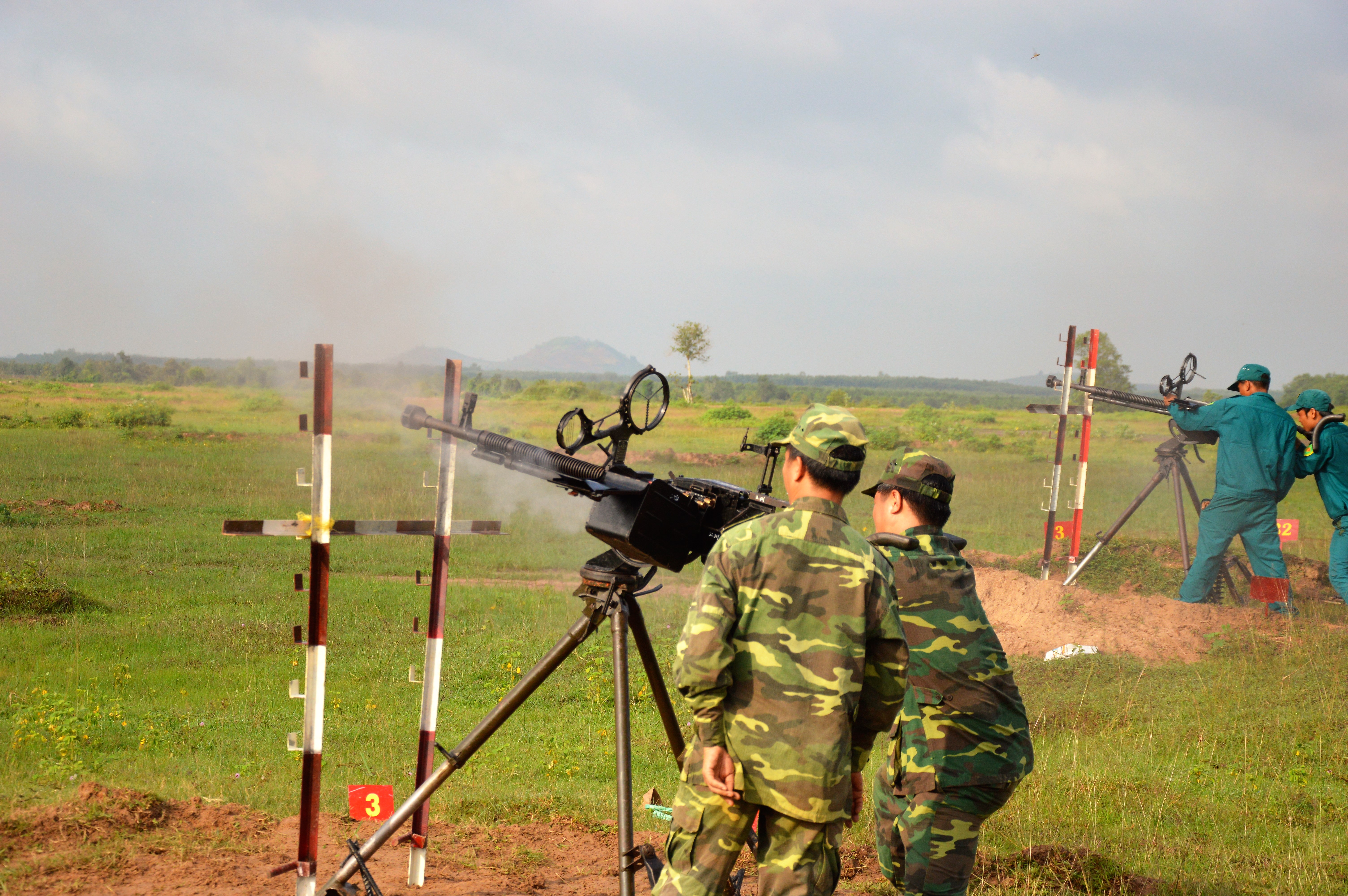 Đối với các trung đội súng máy phòng không 12,7mm phải trải qua các nội dung: thực hành cơ động, chiếm lĩnh trận địa, làm công tác chuẩn bị chiến đấu với các thao tác của các xạ thủ như kiểm tra binh khí, lấy thăng bằng súng, thống nhất điểm ngắm… Thực hành chiến đấu bắn các mục tiêu cố định và mục tiêu di động. Các trung đội đều sử dụng thành thạo vũ khí trang bị, nắm vững yếu lĩnh bắn, hiệp đồng chặt chẽ, nhiều trung đội tiêu diệt mục tiêu ngay từ loạt đạn đầu, hoàn thành xuất sắc nhiệm vụ và đạt thành tích cao trong các bài bắn. Kết quả, 100% các trung đội súng máy 12,7mm của các đơn vị và Ban CHQS 11 huyện – thị xã đều đạt điểm khá giỏi.