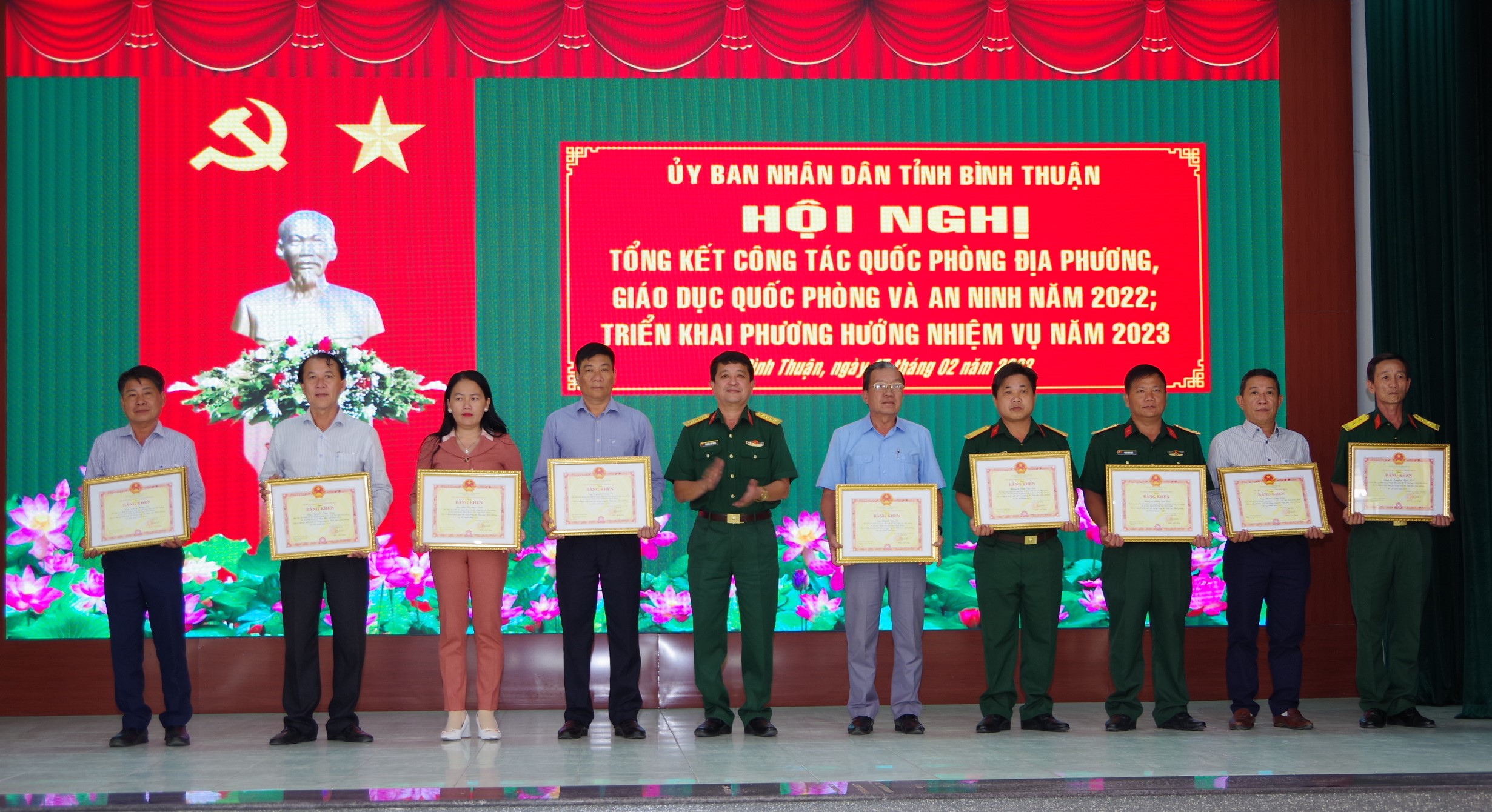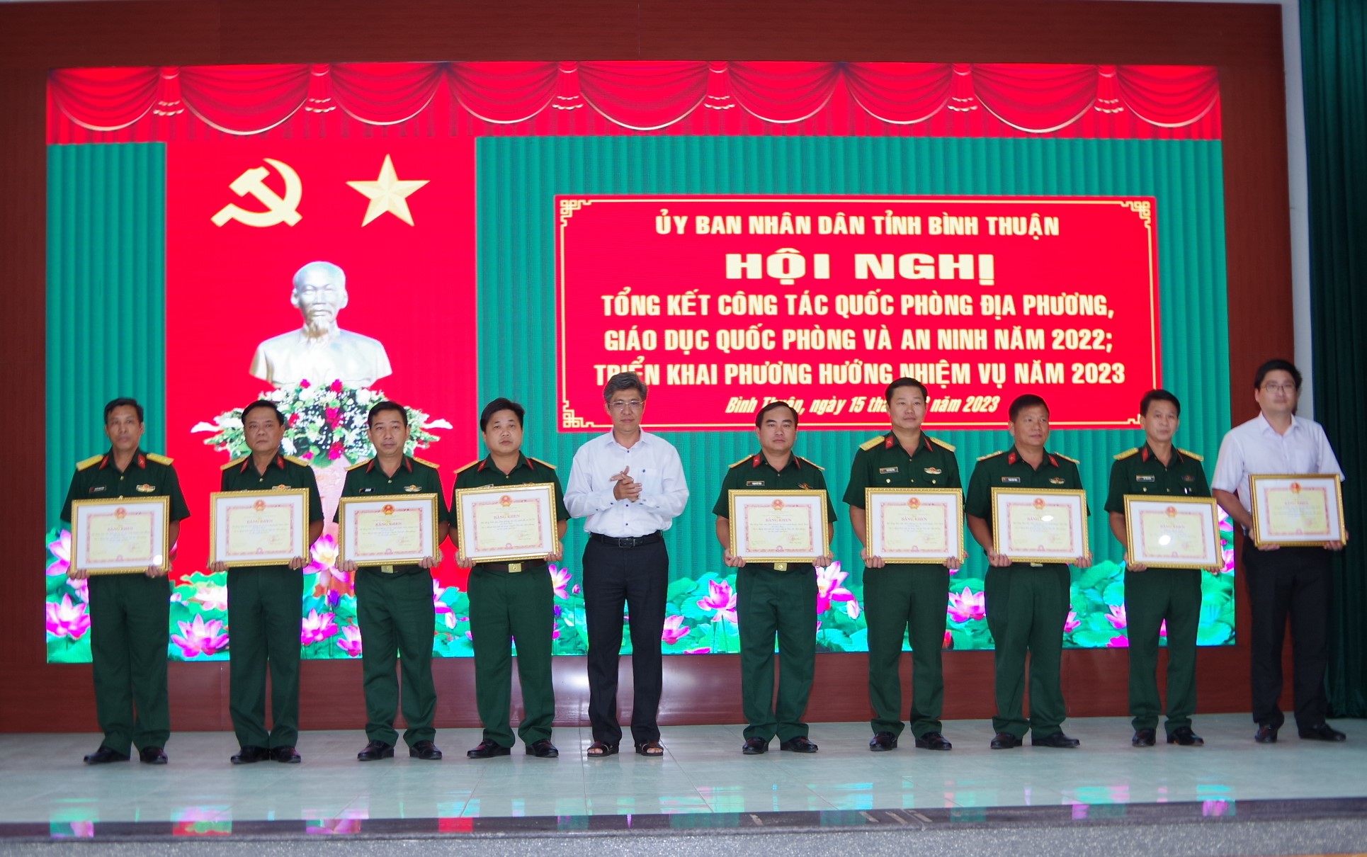 Trong xây dựng lực lượng, đến nay lực lượng dân quân tự vệ chiếm hơn 1,7% so với dân số, tỷ lệ đảng viên trong dân quân tự vệ chiếm gần 30%, xây dựng nhiều mô hình hiệu quả. Năm 2022, 2023, Bình Thuận giao quân đạt chỉ tiêu 100% ở cả 3 cấp, đảm bảo an toàn, không có trường hợp bù đổi sau phúc tra. Các đơn vị, địa phương thực hiện tốt công tác huấn luyện, diễn tập, kết quả kiểm tra có 100% khoa mục đạt khá giỏi, an toàn, chấp hành tốt kỷ luật. Bình Thuận cũng tổ chức việc xây dựng các công trình phòng thủ và chủ động bồi dưỡng kiến thức quốc phòng an ninh cho hơn 9.400 người, trong đó có 44 chức sắc tôn giáo (đạt 100%)…