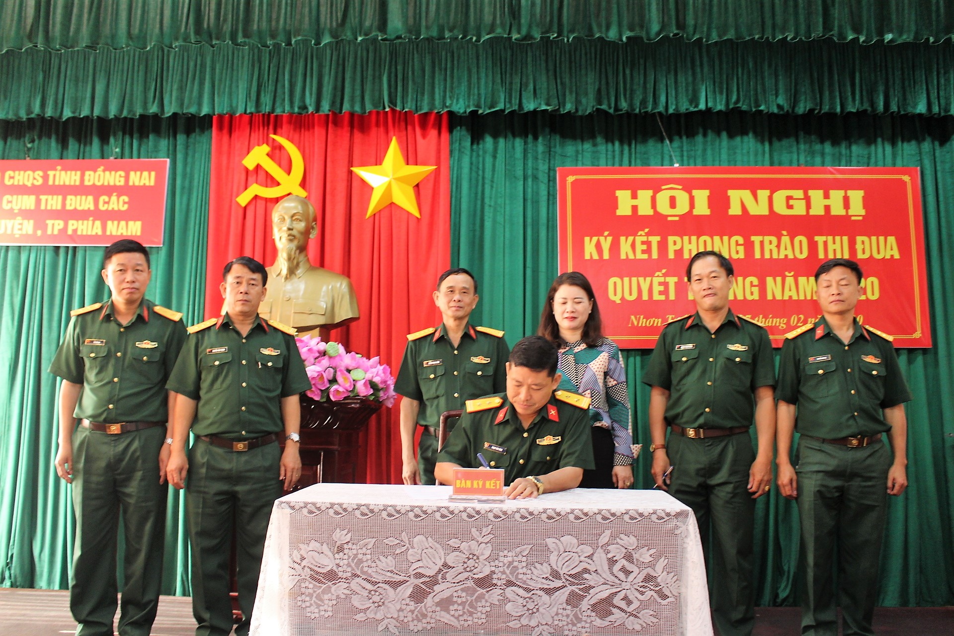(QK7 Online) - Ngày 27 tháng 2, tại Ban CHQS huyện Nhơn Trạch (Đồng Nai), Đại tá Huỳnh Thanh Liêm - Chính ủy Bộ CHQS tỉnh chủ trì hội nghị ký kết phong trào thi đua quyết thắng năm 2020 các đơn vị cụm thi đua phía Nam gồm Ban CHQS các huyện: Nhơn Trạch, Long Thành, Vĩnh Cửu, Trảng Bom và TP. Biên Hòa.