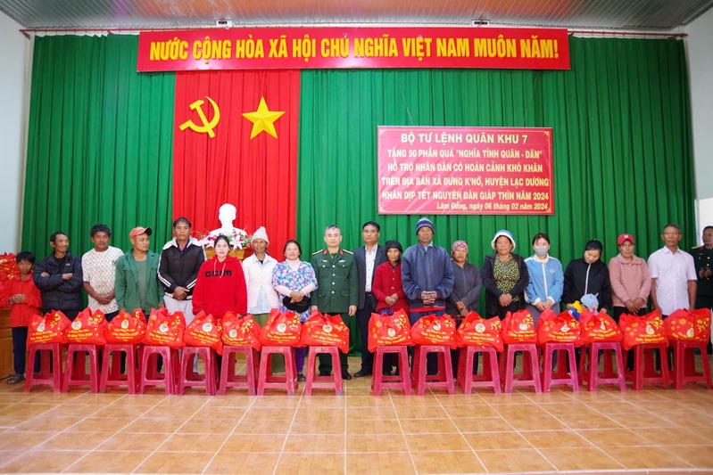 Đại tá Nguyễn Văn Sơn, Chính ủy Bộ CHQS tỉnh Lâm Đồng trao các phần quà "Nghĩa tình quân - dân" hỗ trợ người dân có hoàn cảnh khó khăn.
