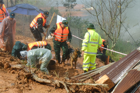 LLVT sử dụng chó nghiệp vụ tìm kiếm người bị nạn trong diễn tập.