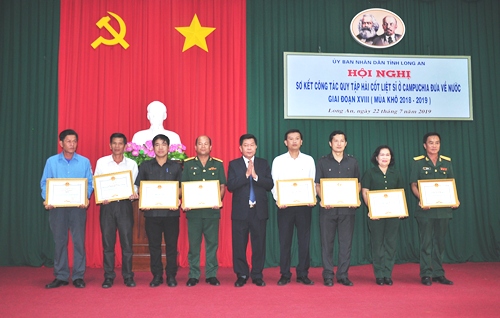 UBND tỉnh Long An Tặng bằng khen cho 8 tập thể và 20 cá nhân của hai nước Việt Nam và Campuchia có thành tích xuất sắc trong thực hiện nhiệm vụ tìm kiếm, qui tập hài cốt liệt sĩ Quân tình nguyện Việt Nam hi sinh ở Campuchia đưa về nước, giai đoạn XVIII (mùa khô 2018 - 2019).