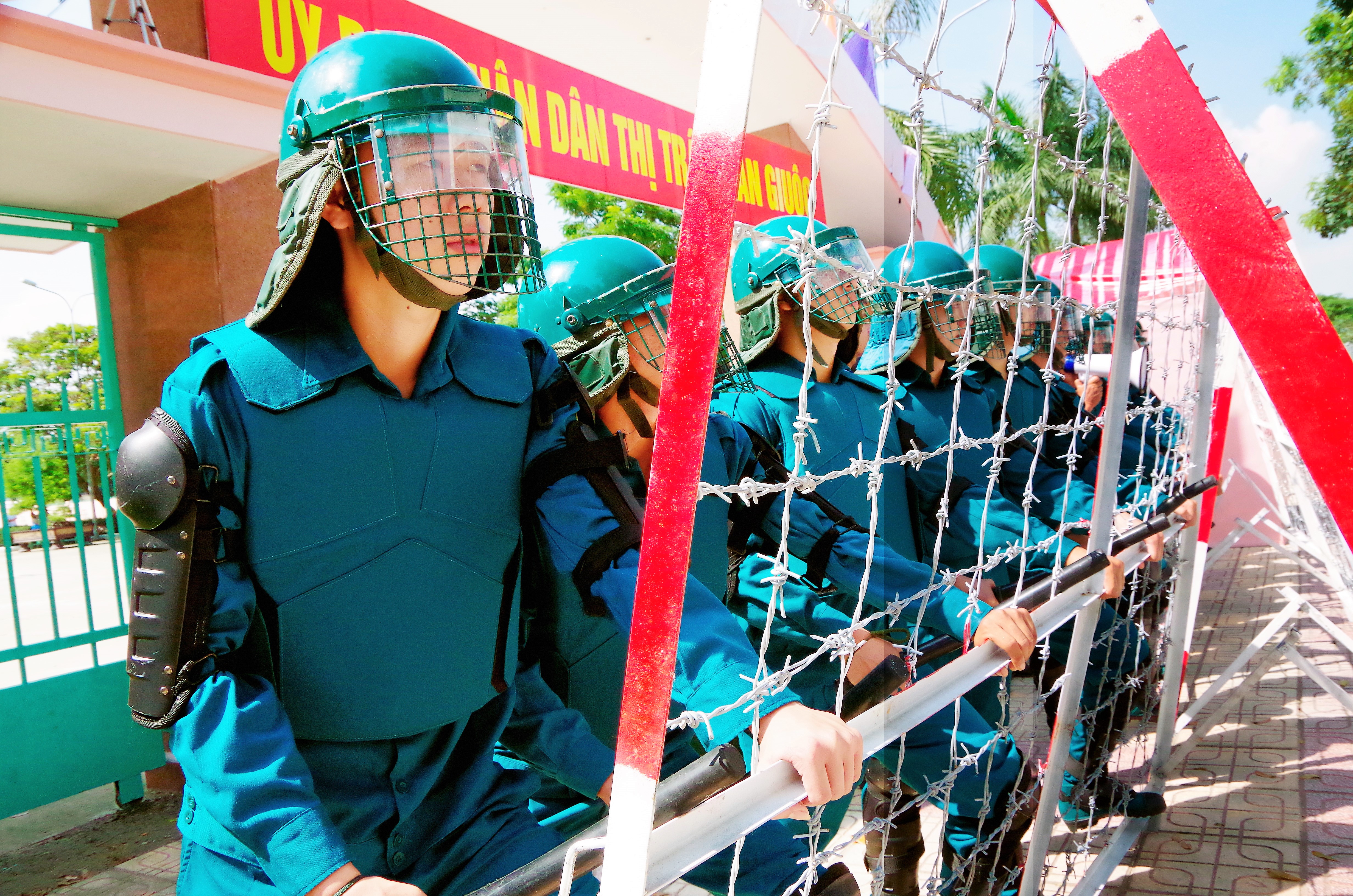 Lực lượng dân quân tự vệ tham gia diễn tập bảo vệ trị an địa bàn.