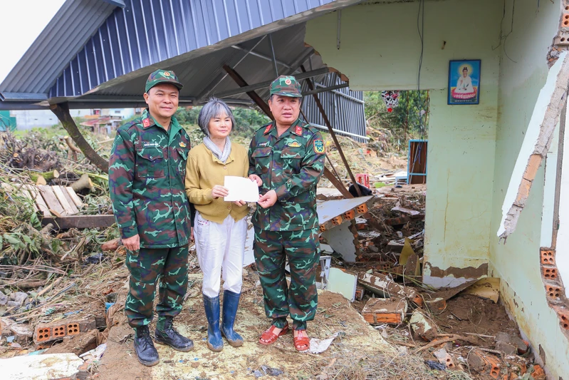 Mưa lũ khiến căn nhà của bà Nguyễn Thị Ngọc Thơm bị hư hỏng nặng, hơn 2 nghìn mét vuông vườn hồng cũng bị thiệt hại. Cán bộ, chiến sĩ Sư đoàn 302, Lữ đoàn 657 và Cục Chính trị Quân khu đã đến giúp gia đình bà dọn dẹp nhà cửa, gia cố lại vườn cây.