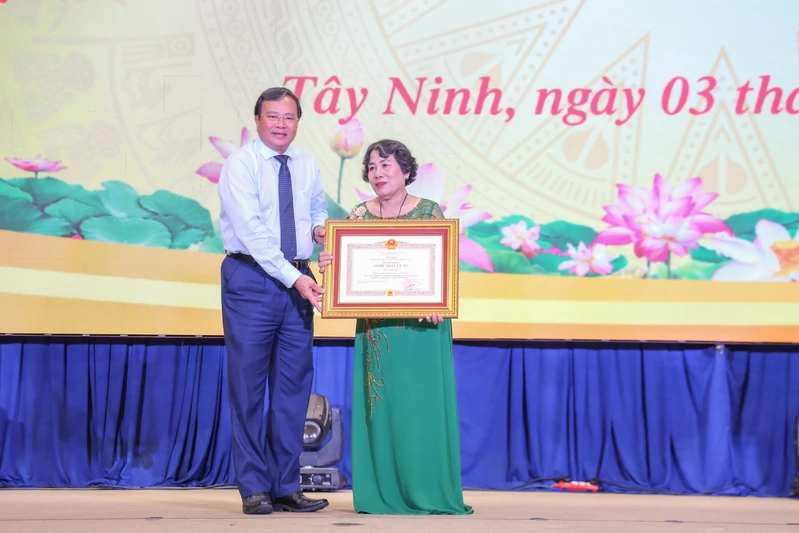 Đồng chí Lê Văn Hẳn, Chủ tịch UBND tỉnh Tây Ninh trao danh hiệu Nghệ nhân Ưu tú cho bà Trần Thị Lành, xã Tân Lân, tỉnh Tây Ninh.