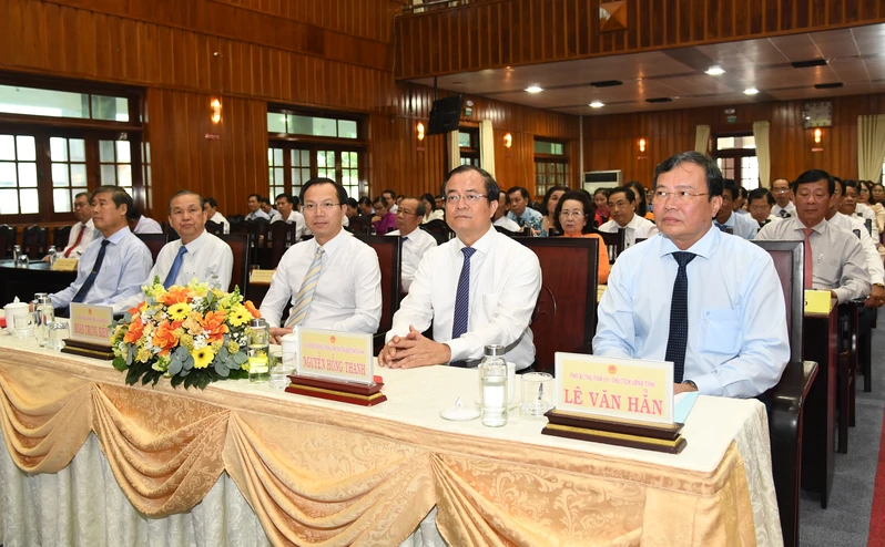 Đồng chí Lê Văn Hẳn, Chủ tịch UBND tỉnh Tây Ninh (ngoài cùng bên phải) và các đồng chí trong Thường vụ Tỉnh ủy, UBND tỉnh Tây Ninh; lãnh đạo tỉnh Tây Ninh qua các thời kỳ dự buổi lễ.