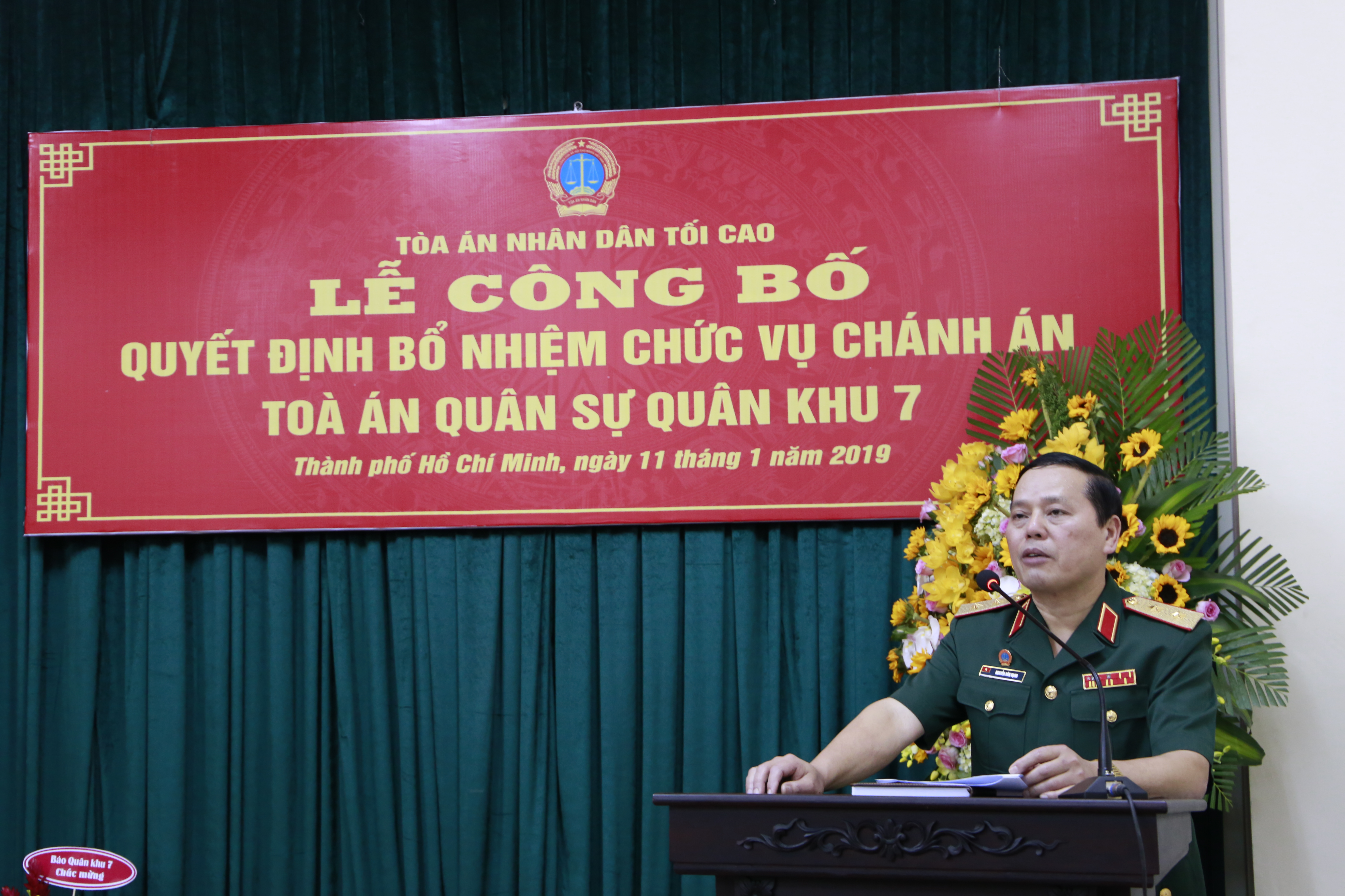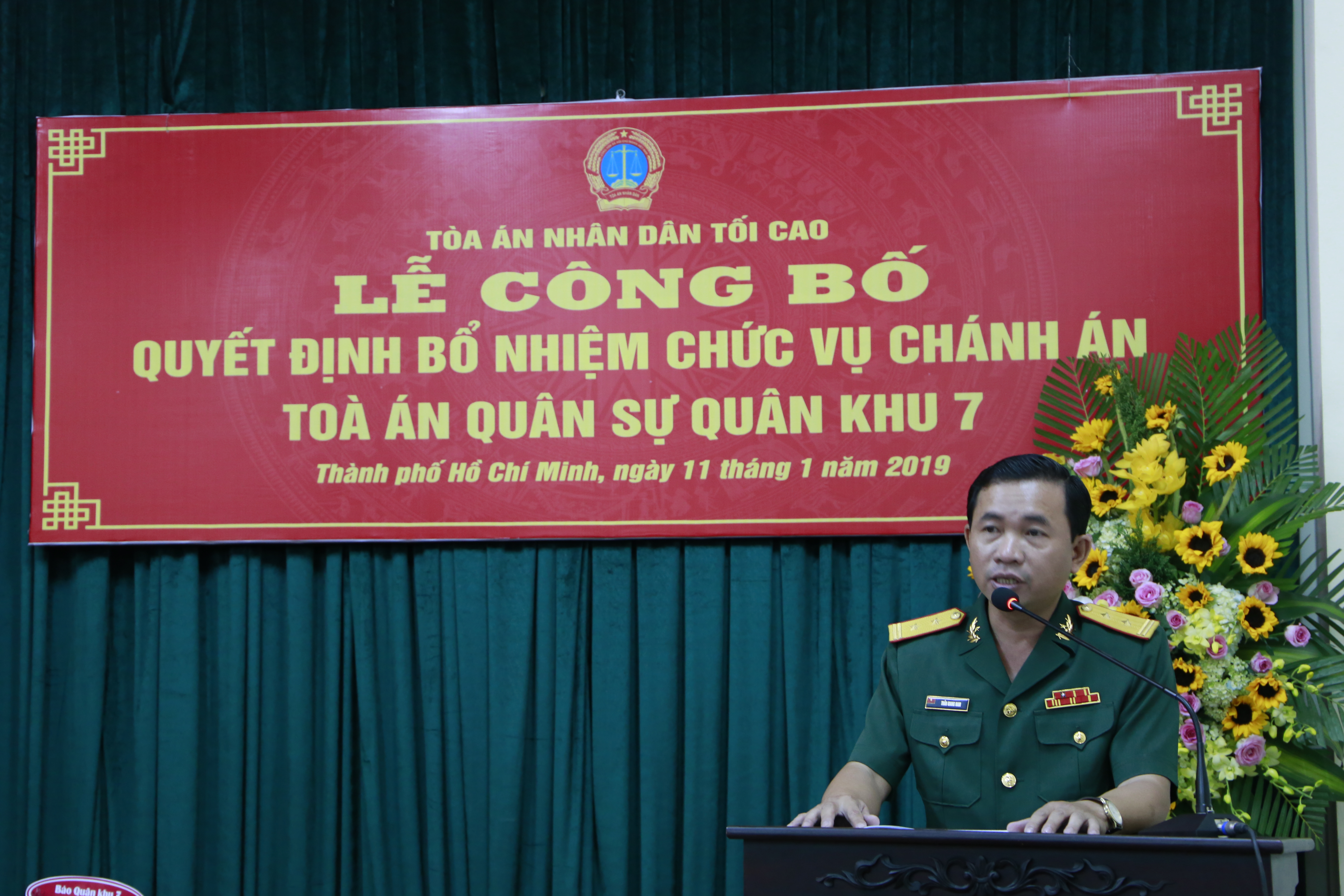 Trung tướng cũng đề nghị đồng chí Trần Giang Nam tiếp tục phát huy những thành tích đã đạt được, không ngừng tu dưỡng, nâng cấp phẩm chất đạo đức, bản lĩnh chính trị và năng lực chuyên môn, khắc phục khó khăn, ra sức phấn đấu, đoàn kết, chung sức, chung lòng xây dựng Tòa án Quân sự hai cấp thuộc Quân khu 7 thành một khối đoàn kết, thống nhất, trong sạch, vững mạnh. Đồng thời thực hiện tốt phương châm mà Chủ tịch Hồ Chí Minh dã dạy là: “Phụng công, thủ pháp, chí công, vô tư” nhằm hoàn thành xuất sắc mọi nhiệm vụ được giao.