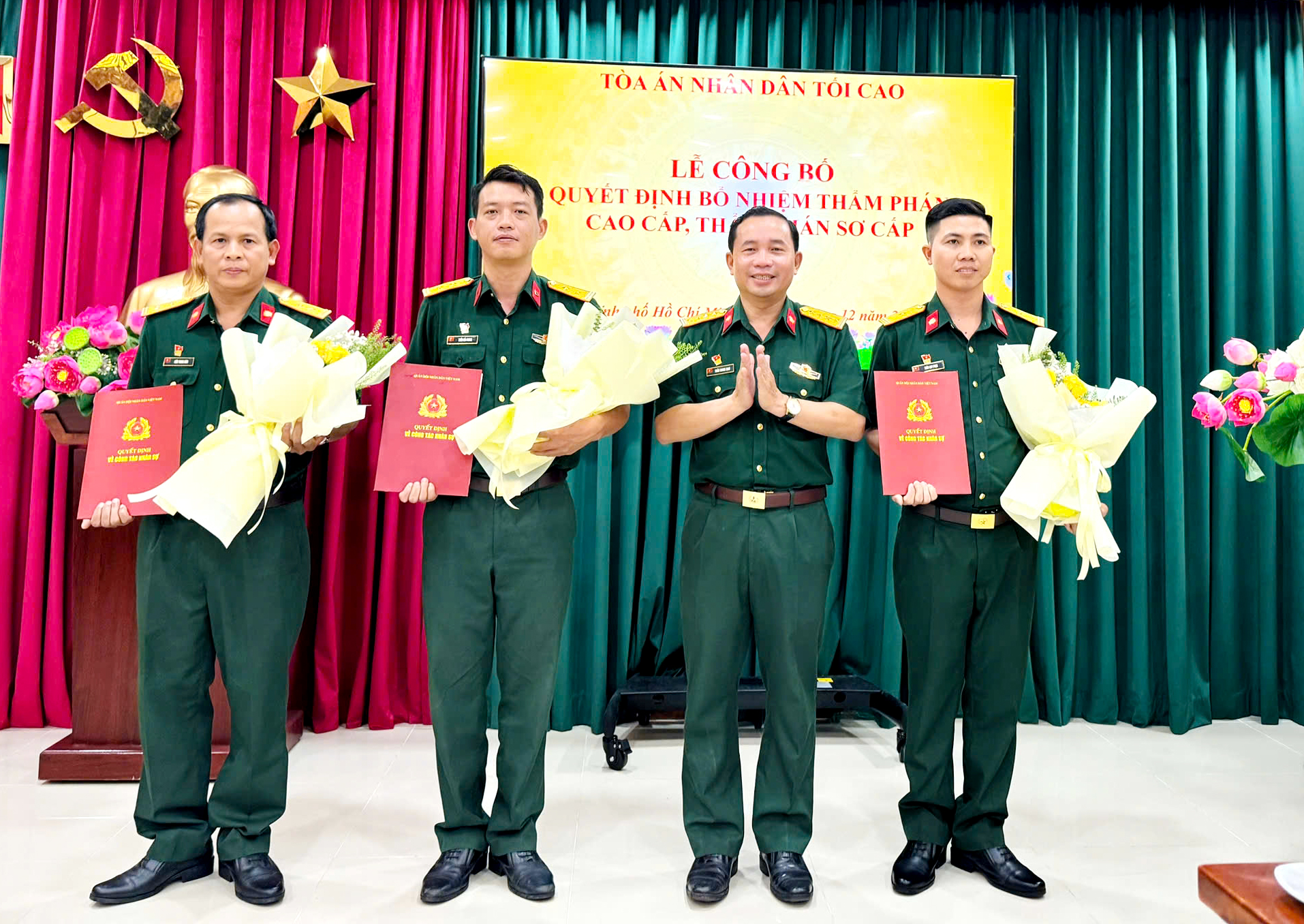 Trao quyết định của Chủ tịch nước bổ nhiệm các chức danh thẩm phán: Trung tá Kiều Trung Kiên, Phó Chánh án Tòa án Quân sự Quân khu 7 được bổ nhiệm chức danh Thẩm phán cao cấp; Thiếu tá Trần Huy Phục, Thư ký Tòa án Quân sự Khu vực Quân khu 7 và Trung tá Trần Hải Phong, Trưởng ban Hành chính Tòa án Quân sự Khu vực Quân khu 7 được bổ nhiệm chức danh Thẩm phán sơ cấp.