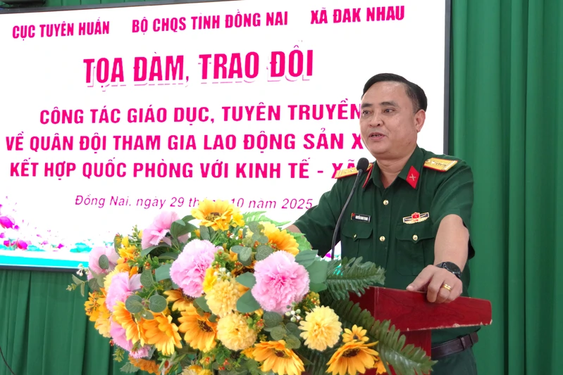 (QK7 Online) - Ngày 29/10, tại xã Đak Nhau, tỉnh Đồng Nai, Cục Tuyên huấn phối hợp Bộ CHQS tỉnh Đồng Nai và xã Đak Nhau tổ chức Tọa đàm, trao đổi "Công tác giáo dục, tuyên truyền về Quân đội tham gia lao động sản xuất, kết hợp quốc phòng với kinh tế - xã hội". Đại tá Bùi Lê Ninh, Phó trưởng Phòng Tuyên truyền - Cổ động, Cục Tuyên huấn chủ trì Tọa đàm.