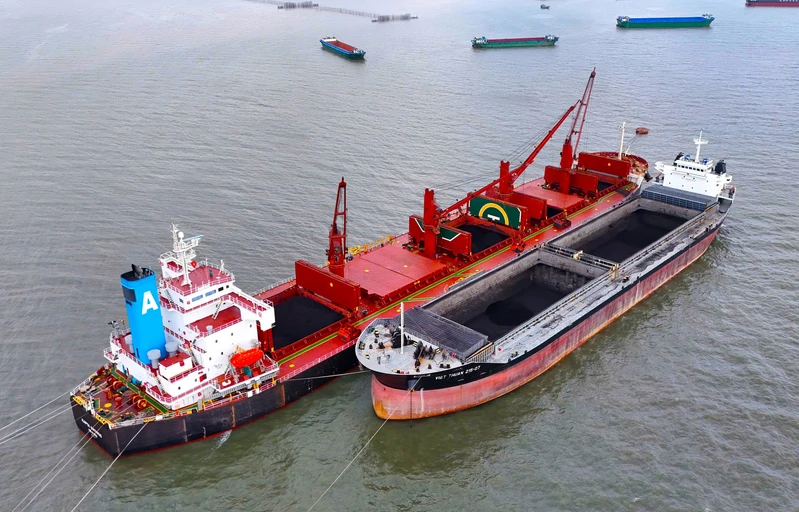 Những tấn hàng đầu tiên được bốc dỡ sang tàu chuyển tải.