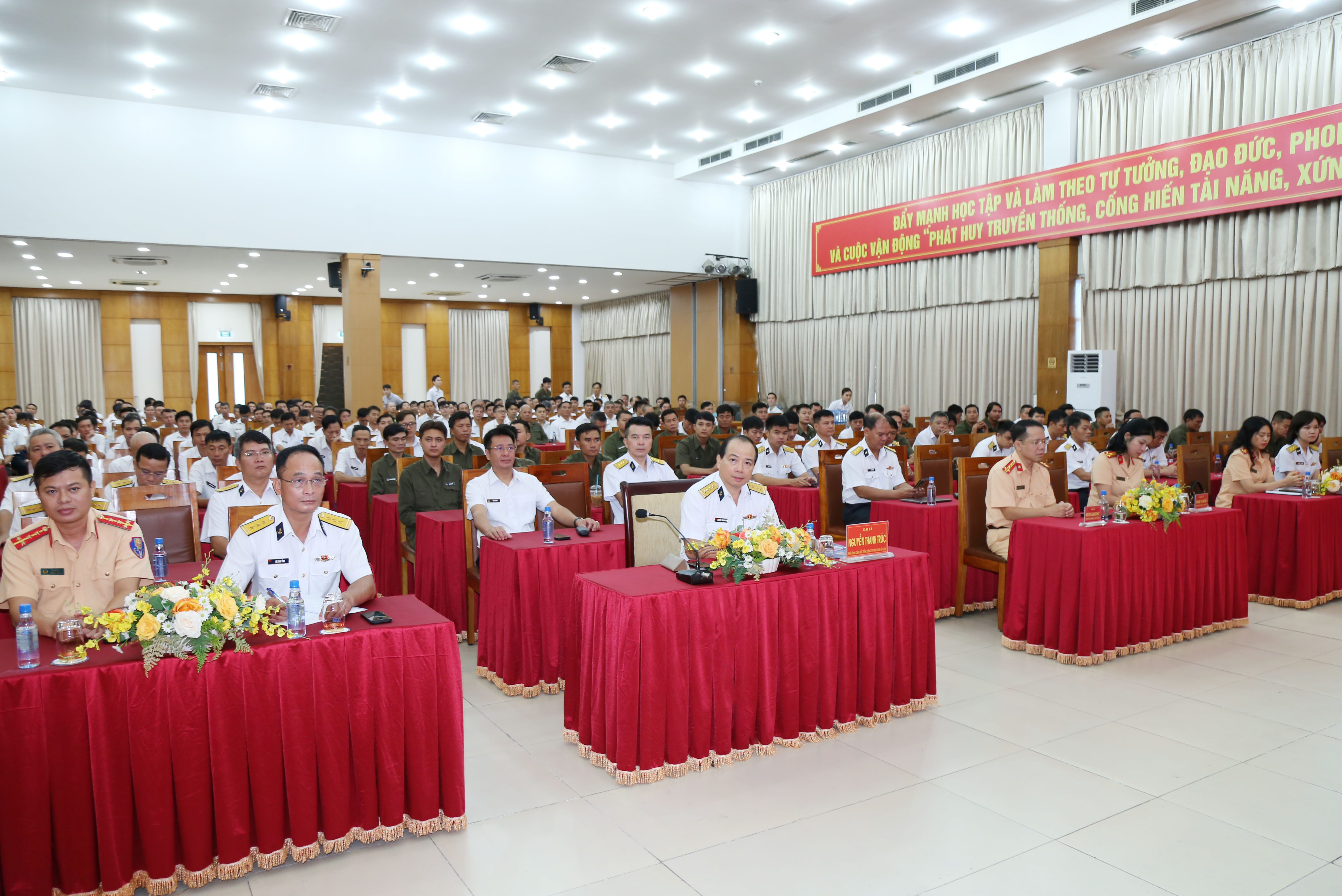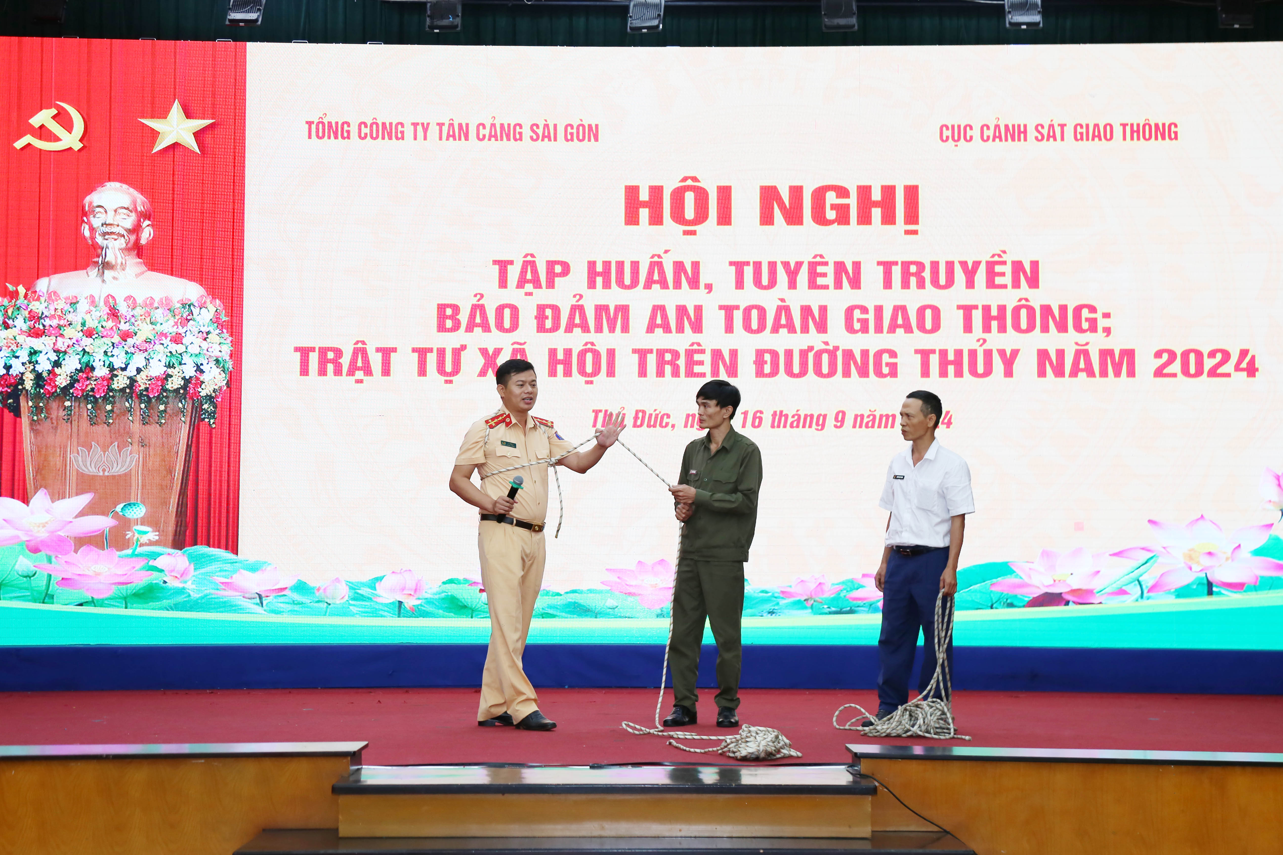 Báo cáo viên của Cục Cảnh sát giao thông tuyên truyền Luật giao thông đường bộ.