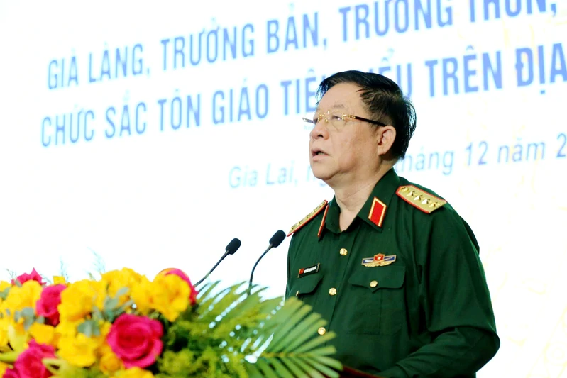 Đại tướng Nguyễn Trọng Nghĩa nhấn mạnh những đóng góp, vai trò của các già làng, trưởng thôn, trưởng bản, người có uy tín, chức sắc tôn giáo mang ý nghĩa đặc biệt quan trọng.