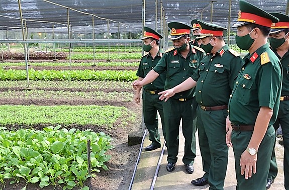 Đoàn công tác kiểm tra khu tăng gia sản xuất của đơn vị.