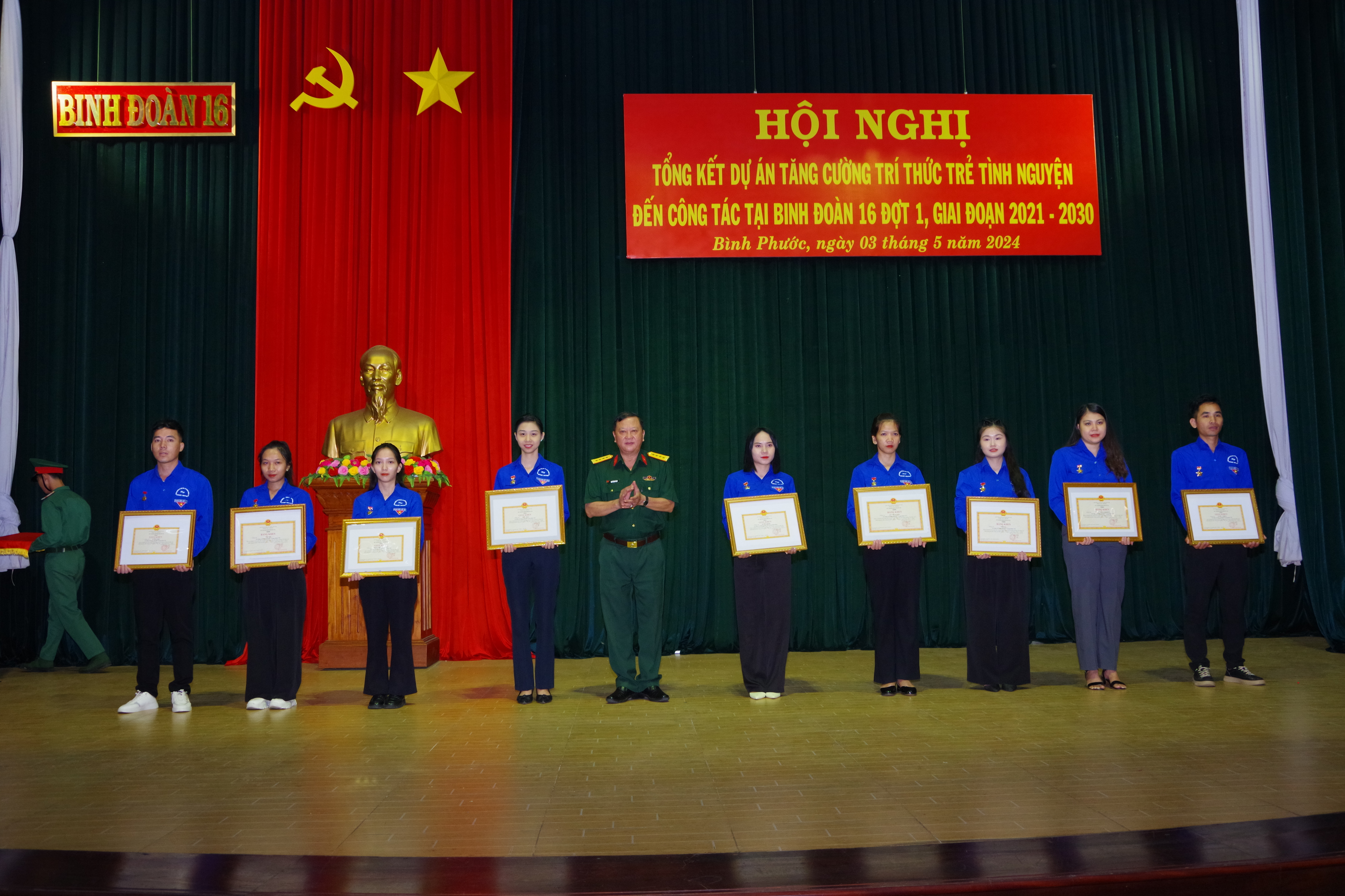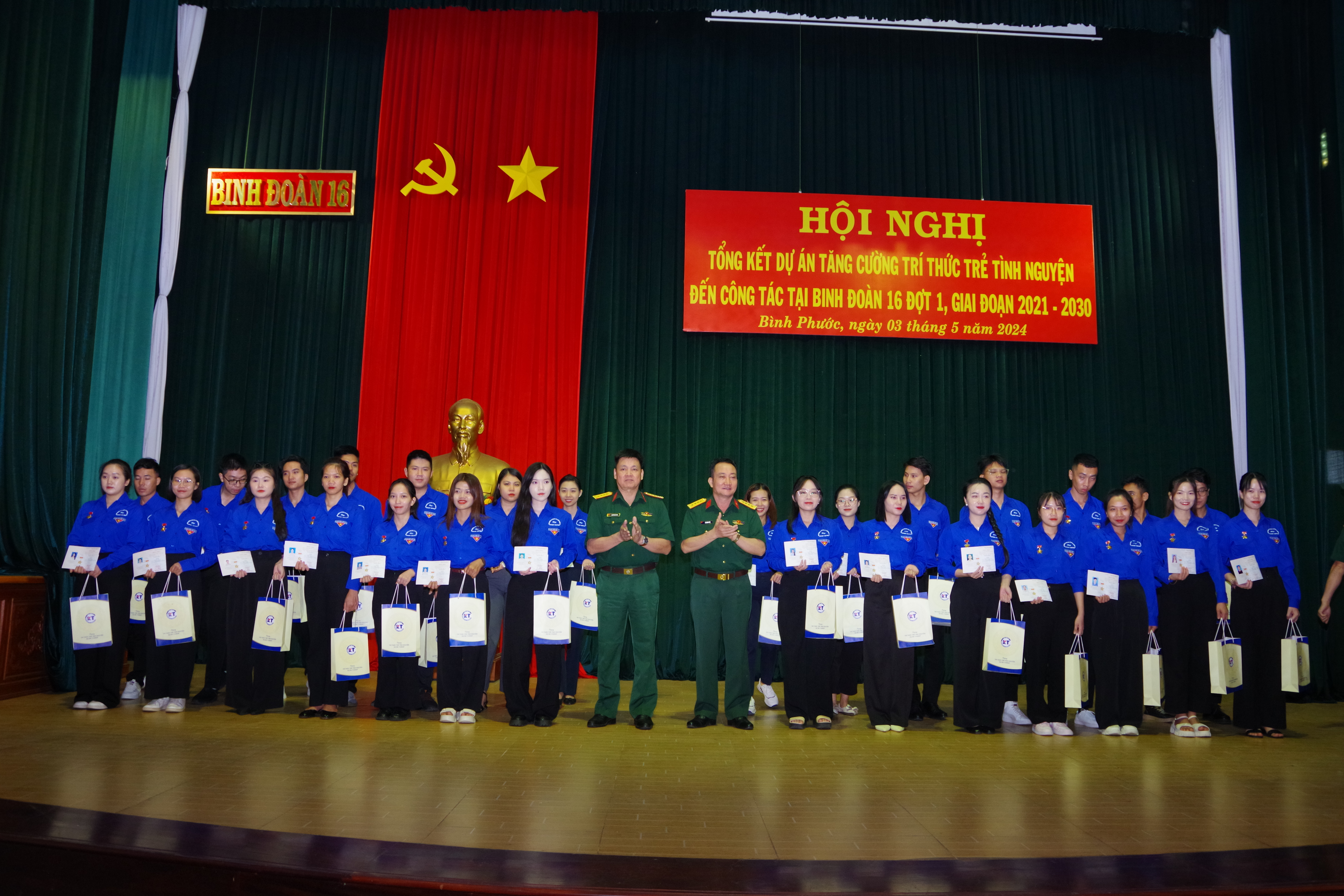 Dịp này, Tư lệnh Binh đoàn 16 tặng Bằng khen cho 9 cá nhân đạt thành tích xuất sắc nhiệm vụ đợt 1 năm 2022-2024. Đồng thời, cấp giấy chứng nhận, huy hiệu và tặng quà cho TTTTN hoàn thành dự án “Tăng cường trí thức trẻ tình nguyện đến công tác tại Binh đoàn 16 đợt 1 giai đoạn 2021-2030.