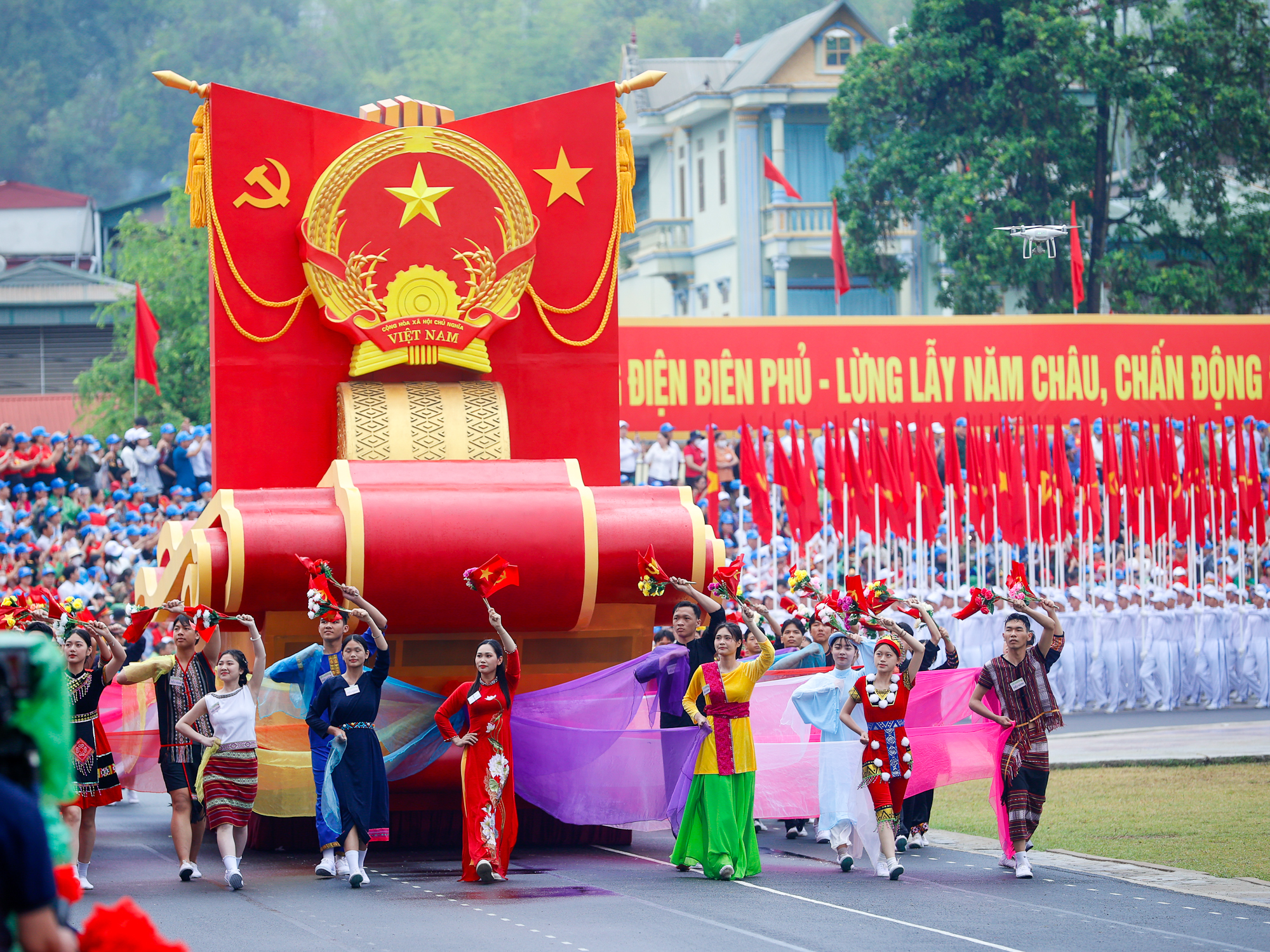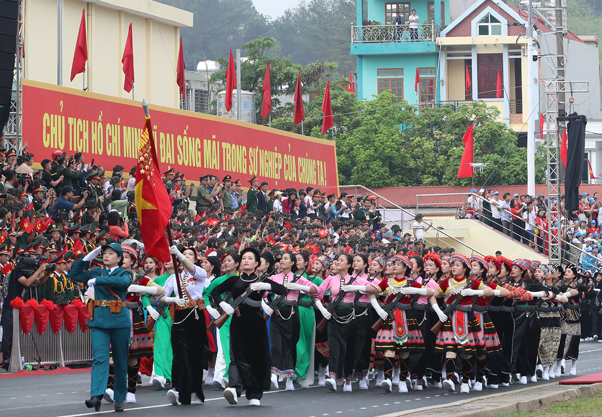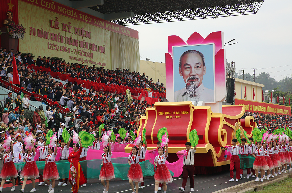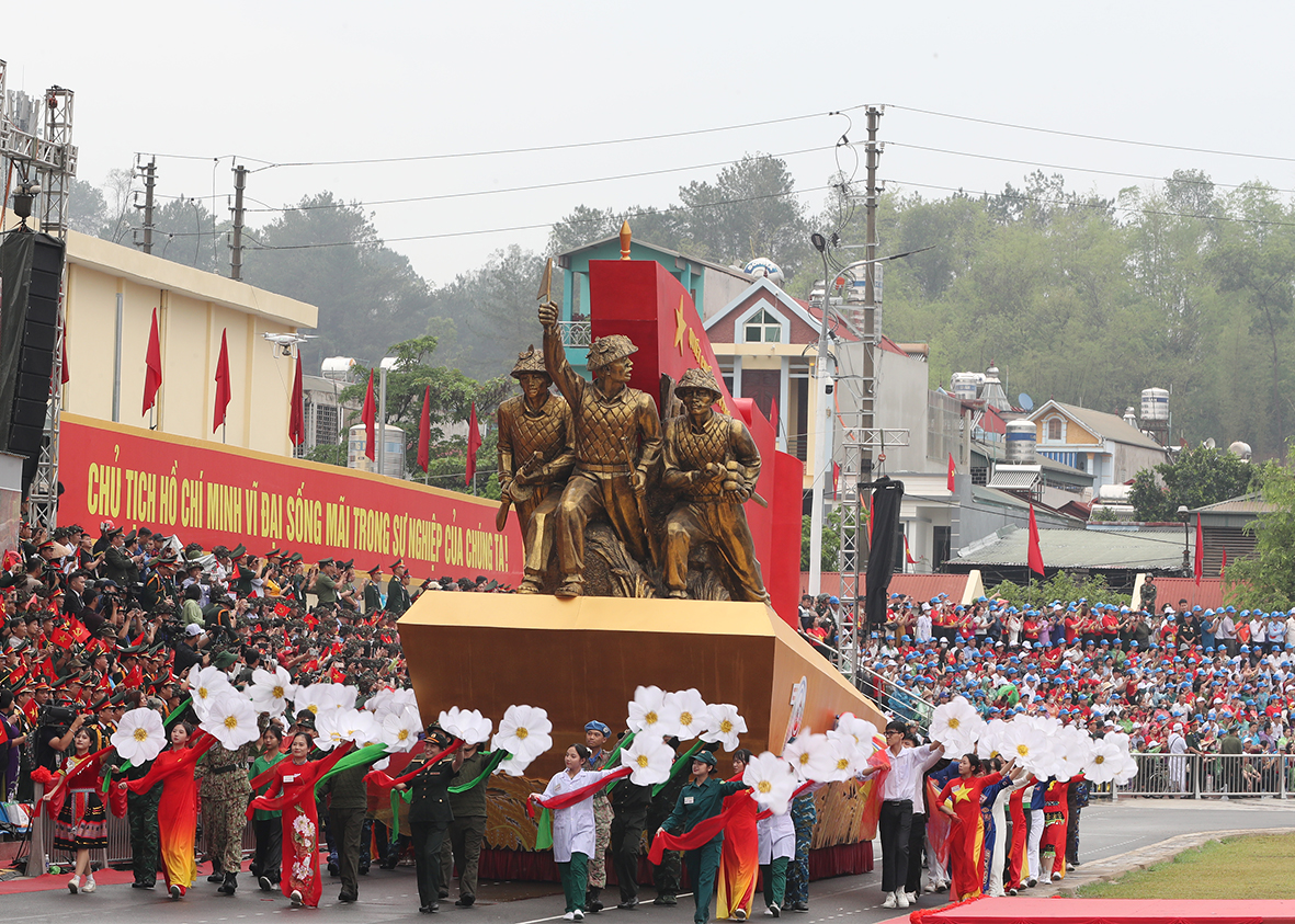 Sau các bài diễn văn, phát biểu của Thủ tướng Chính phủ Phạm Minh Chính, đại diện chiến sĩ Điện Biên, đại diện thế hệ trẻ; nghi lễ trao Huân chương Độc lập hạng Nhất cho Đảng bộ, chính quyền và Nhân dân các dân tộc tỉnh Điện Biên và cuối cùng là màn diễu binh, diễu hành hùng tráng.