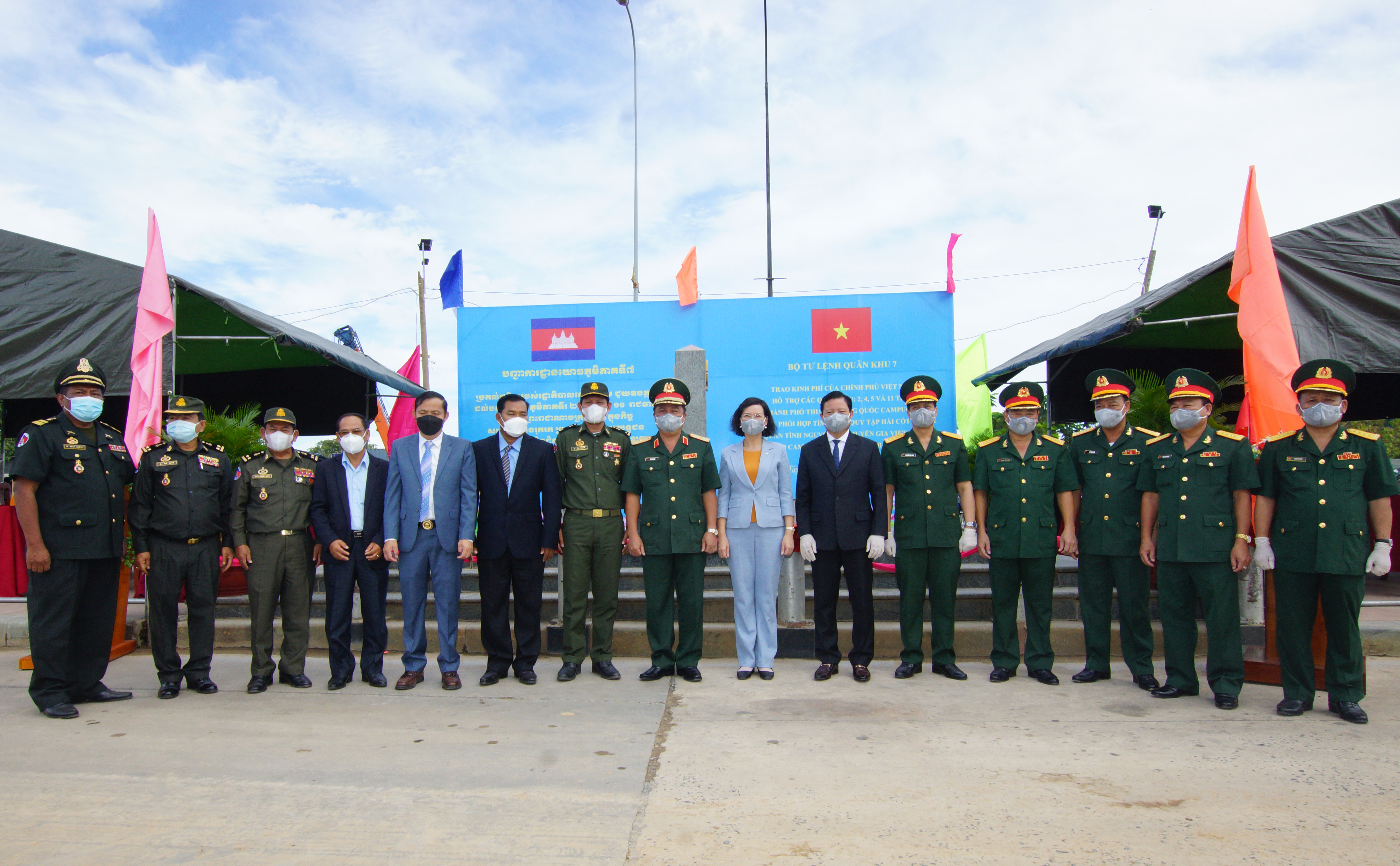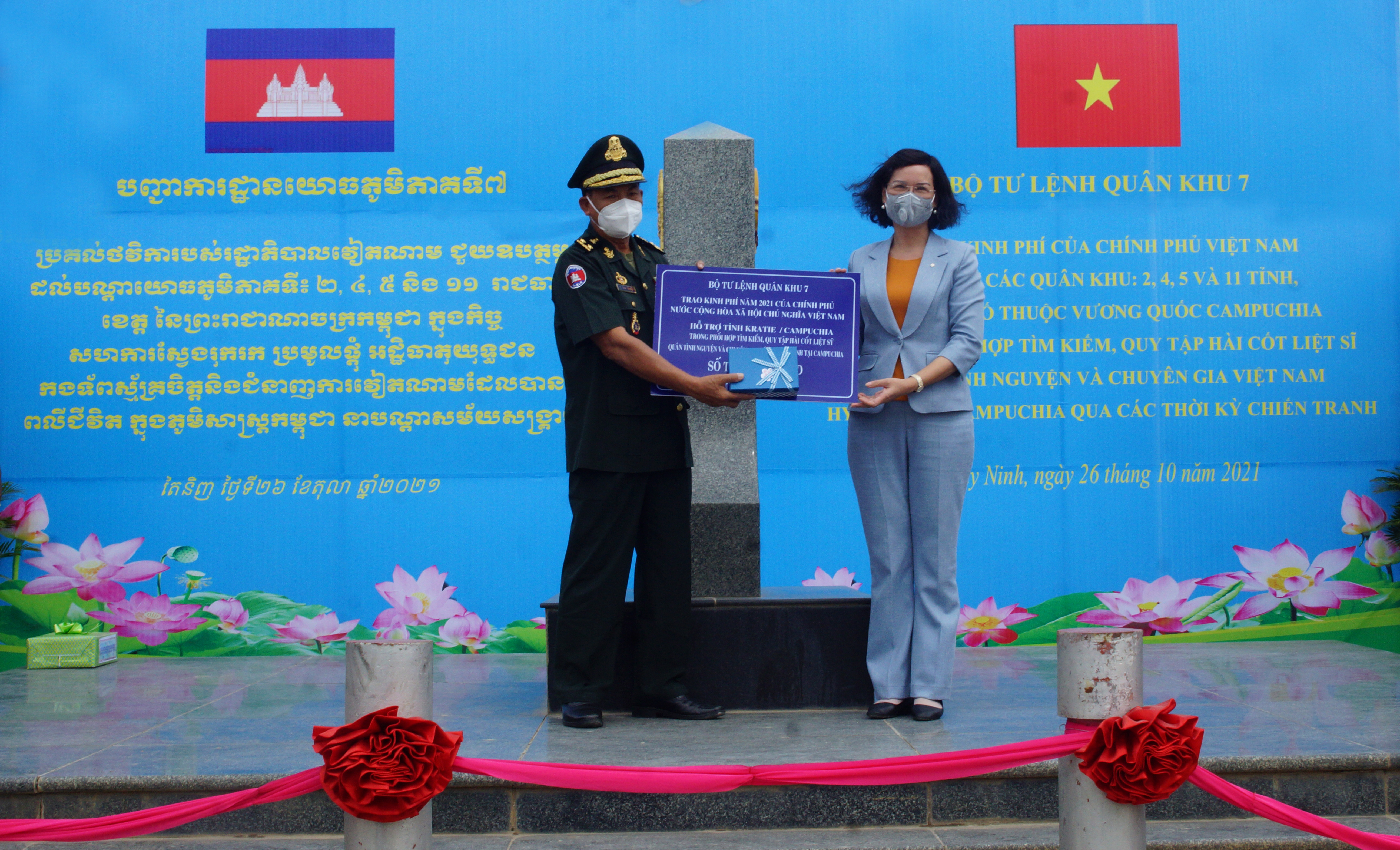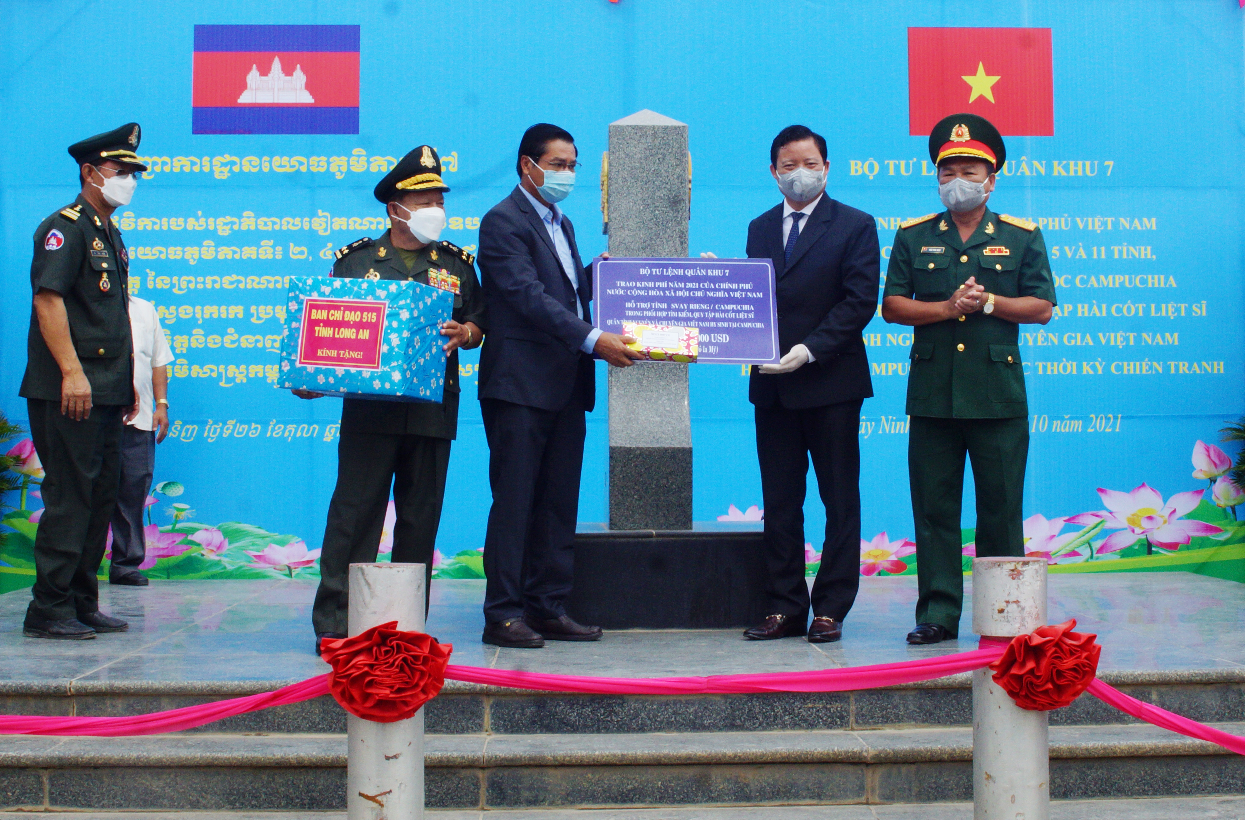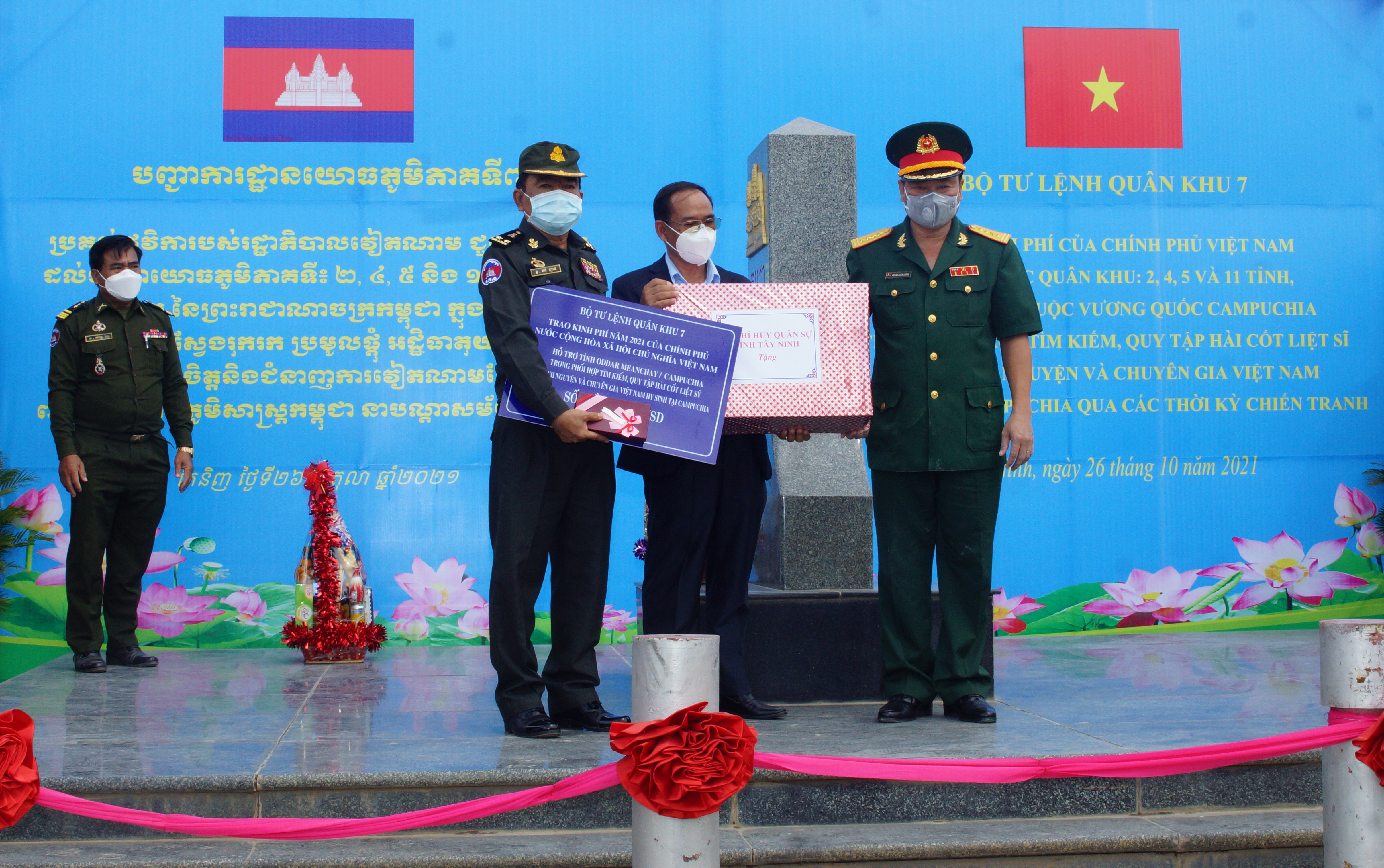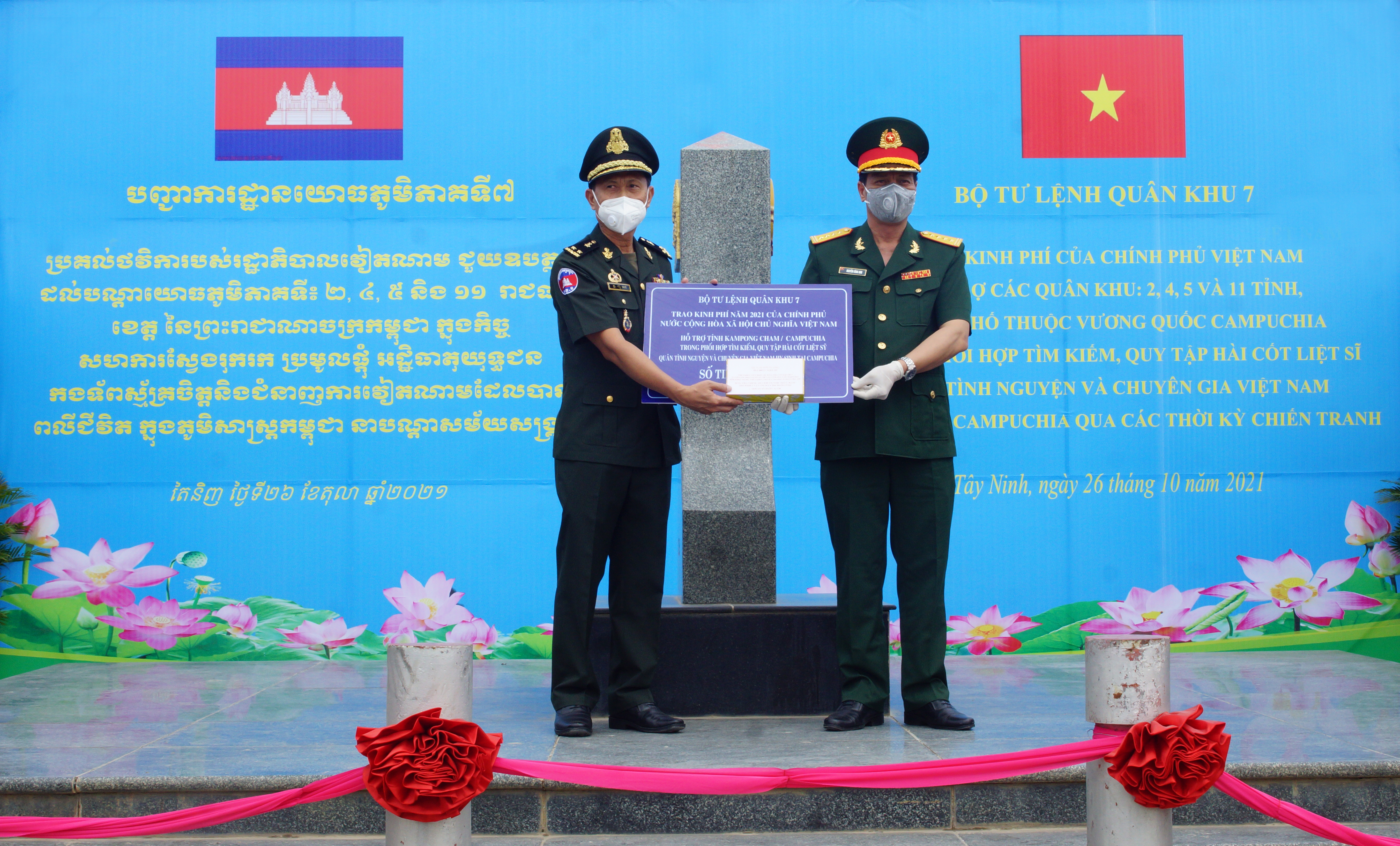 (QK7 Online) – Năm 2021, do tình hình diễn biến phức tạp của dịch bệnh Covid-19, trên cơ sở thống nhất của Ủy ban Chuyên trách Chính phủ hai nước Việt Nam và Campuchia, ngày 26/10/2021, Bộ Tư lệnh Quân khu 7 trao kinh phí hỗ trợ của Chính phủ Việt Nam cho các Quân khu 2, Quân khu 4, Quân khu 5 và các tỉnh, thành phố thuộc Vương quốc Campuchia tại Cột mốc biên giới 171, Cửa khẩu quốc tế Mộc Bài, Việt Nam.