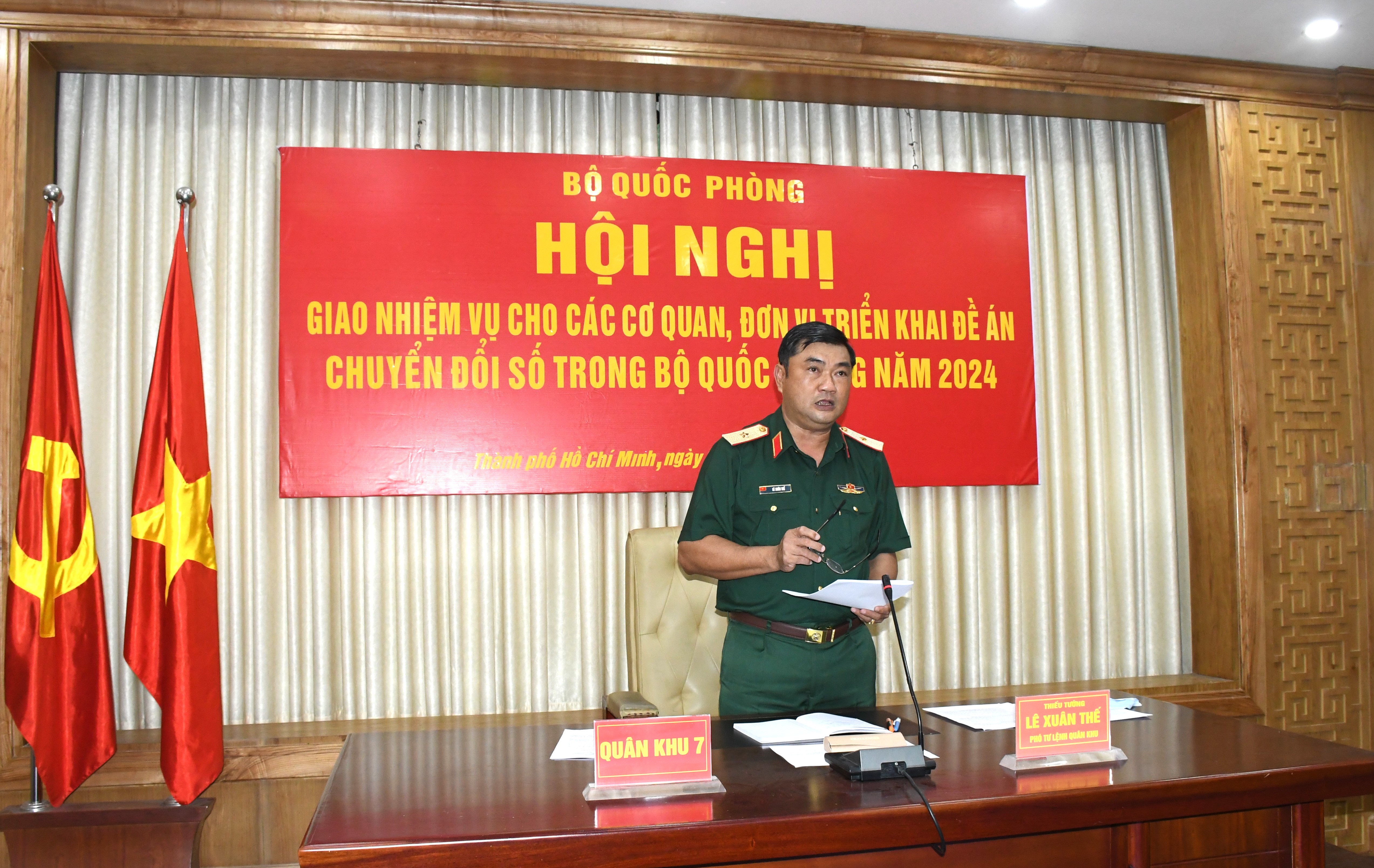 Thiếu tướng Lê Xuân Thế, Phó Tư lệnh Quân khu 7 phát biểu tại hội nghị, cho biết Quân khu 7 được Bộ Quốc phòng chọn xây dựng điểm về Chuyển đổi số khối Quân khu. Ngay sau khi nhận được kế hoạch triển khai thực hiện Đề án trong Bộ Quốc phòng và các văn bản hướng dẫn của Bộ Tư lệnh 86, Cơ quan, Cục Kế hoạch và Đầu tư về triển khai các nhiệm vụ, dự án chuyển đổi số. Thường vụ Đảng ủy, Bộ Tư lệnh Quân khu đã lãnh đạo, chỉ đạo thực hiện quyết liệt các nội dung, nhiệm vụ.