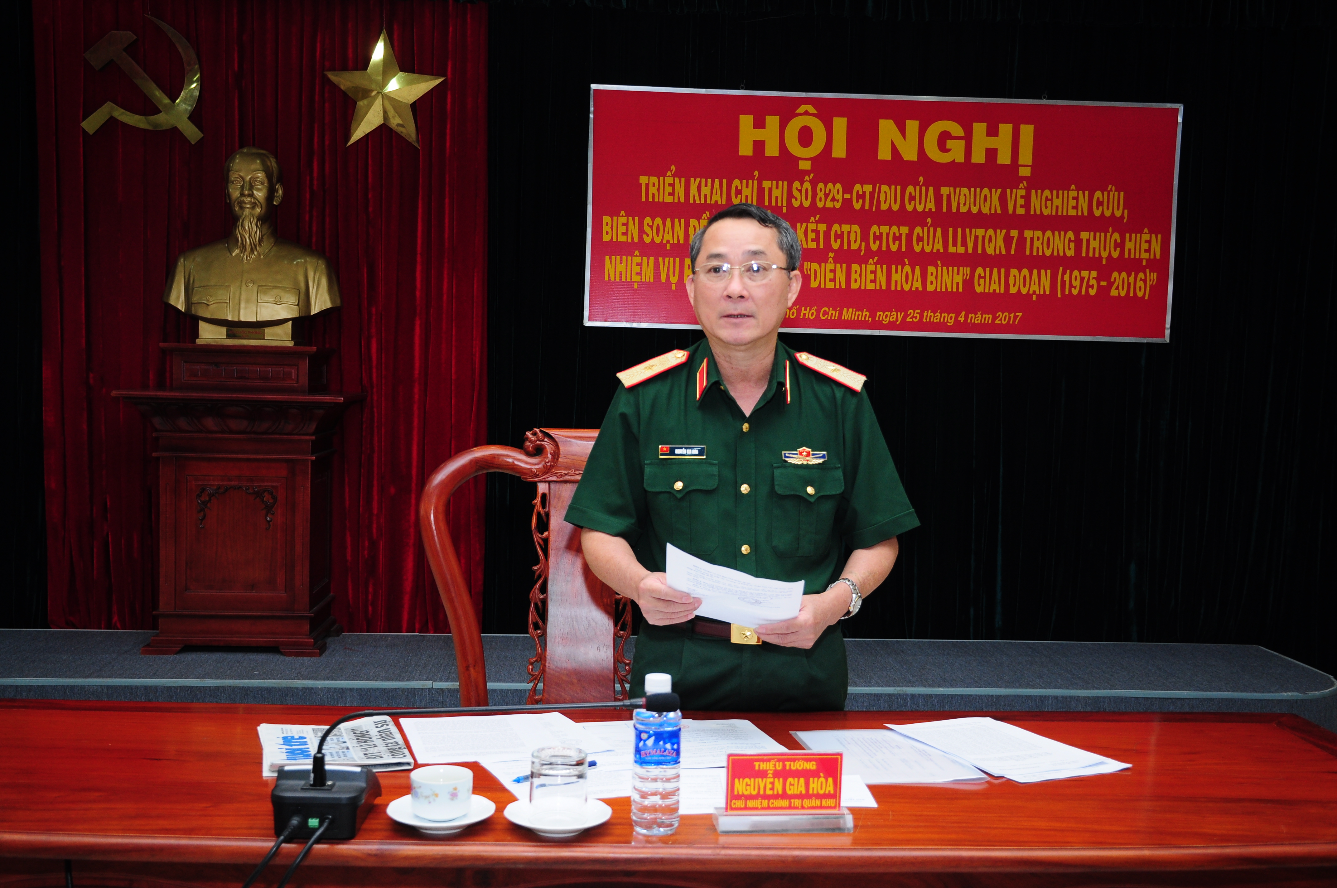(QK7 Online) – Chiều 25/4, Cục Chính trị Quân khu 7 tổ chức Hội nghị triển khai Chỉ thị 829-CT/ĐU của Thường vụ Đảng ủy Quân khu 7 về nghiên cứu, biên soạn đề tài “Tổng kết công tác đảng, công tác chính trị của lực lượng vũ trang Quân khu 7 trong thực hiện phòng chống “diễn biến hòa bình” giai đoạn (1975 – 2016)”. Thiếu tướng Nguyễn Gia Hòa Chủ nhiệm Chính trị Quân khu 7 chủ trì hội nghị. Cùng dự có Thiếu tướng Trần Hữu Tài, Phó CNCT Quân khu và thủ trưởng các cơ quan, đơn vị.