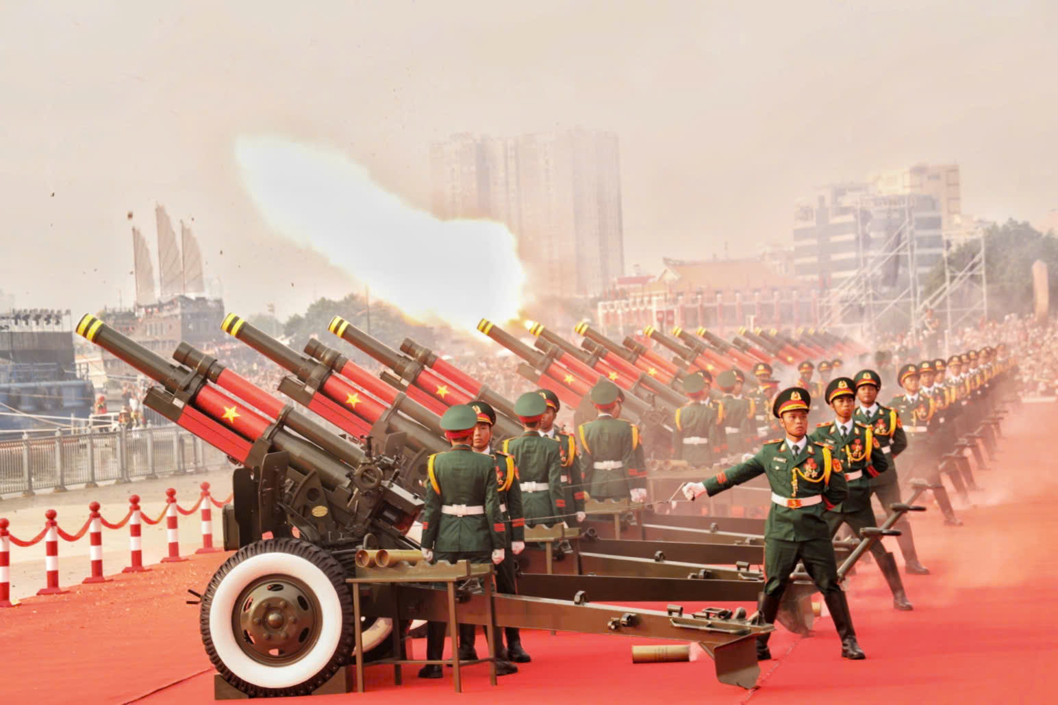 21 phát đại bác lần lượt khai hỏa trên nền nhạc Quốc ca.