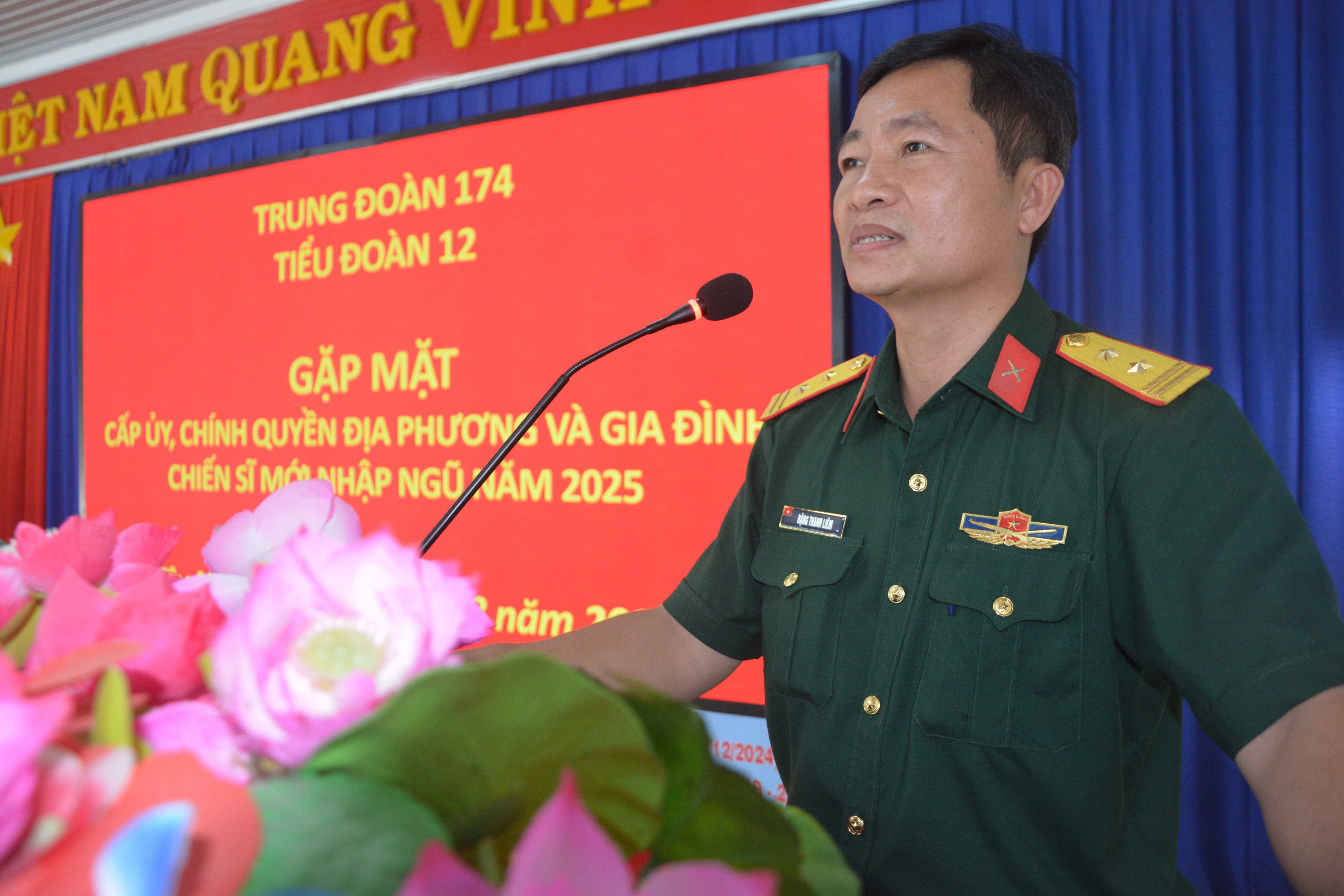 Trung tá Đặng Thanh Liêm, Chính ủy Trung đoàn 174 phát biểu tại buổi họp mặt.