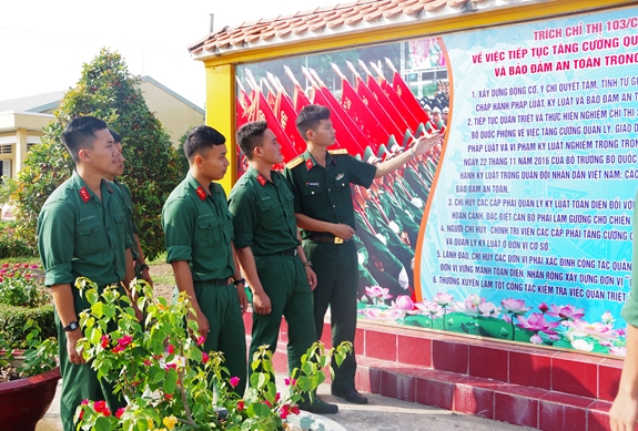 Cán bộ, chiến sĩ Trung đoàn 2, Sư đoàn 9, Quân đoàn 4 tìm hiểu các chỉ thị, nghị quyết được in trên pa nô tại đơn vị