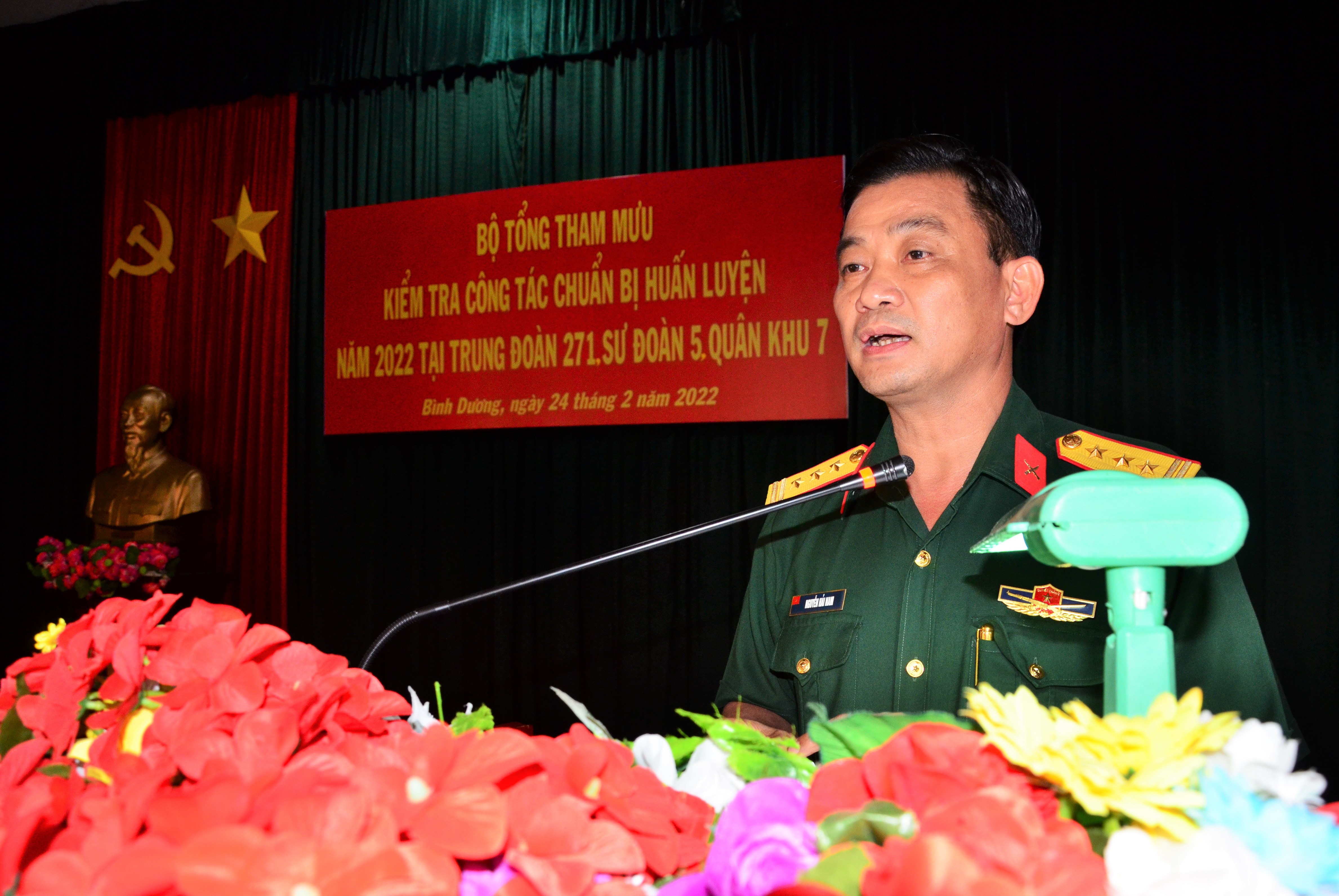 (QK7 Online) - Ngày 24-2, Đoàn công tác Bộ Tổng Tham mưu do Thiếu tướng Trần Đăng Thành, Phó Cục trưởng Cục Quân huấn, Bộ Tổng Tham mưu làm trưởng đoàn, tiến hành kiểm tra công tác chuẩn bị huấn luyện của Trung đoàn 271 - Sư đoàn 5. Tham gia đoàn kiểm tra có Đại tá Phạm Phú Ý, Phó Tham mưu trưởng Quân khu 7.